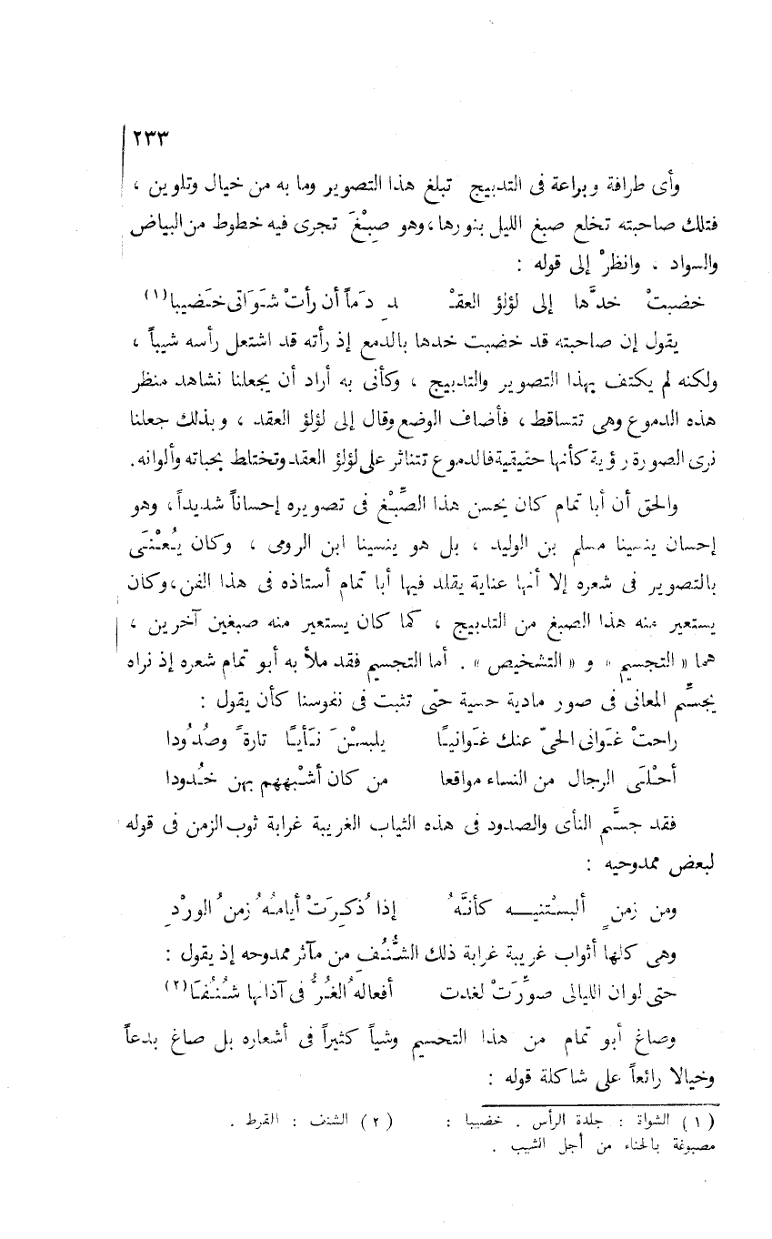 والحق أن أبا تمام كان يحسن هذا الصِّبْغ في تصويره إحسانًا شديدًا، وهو إحسان ينسينا مسلم بن الوليد؛ بل هو ينسينا ابن الرومي، وكان يعنى بالتصوير في شعره؛ إلا أنها عناية يقلد فيها أبا تمام أستاذه في هذا الفن، وكان يستعير منه هذا الصبغ من التدبيج، كما كان يستعير منه صبغين آخرين، هما: التجسيم والتشخيص. أما التجسيم فقد ملأ به أبو تمام شعره؛ إذ نراه يجسِّم المعاني في صور مادية حسية حتى تثبت في نفوسنا كأن يقول: