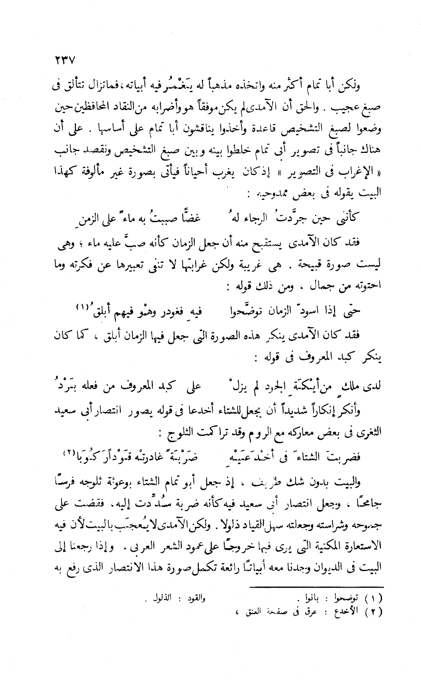 ولكن أبا تمام أكثر منه واتخذه مذهبًا له يغمر فيه أبياته، فما تزال تتألق في صبغ عجيب والحق أن الآمدي لم يكن موفقًا هو وأضرابه من النقاد المحافظين حين وضعوا لصبغ التشخيص قاعدة وأخذوا يناقشون أبا تمام على أساسها، على أن هناك جانبًا في تصوير أبي تمام خلطوا بينه وبين صبغ التشخيص ونقصد جانب: الإغراب في التصوير، إذا كان يغرب أحيانًا فيأتي بصورة غير مألوفة كهذا البيت يقوله في بعض ممدوحيه: