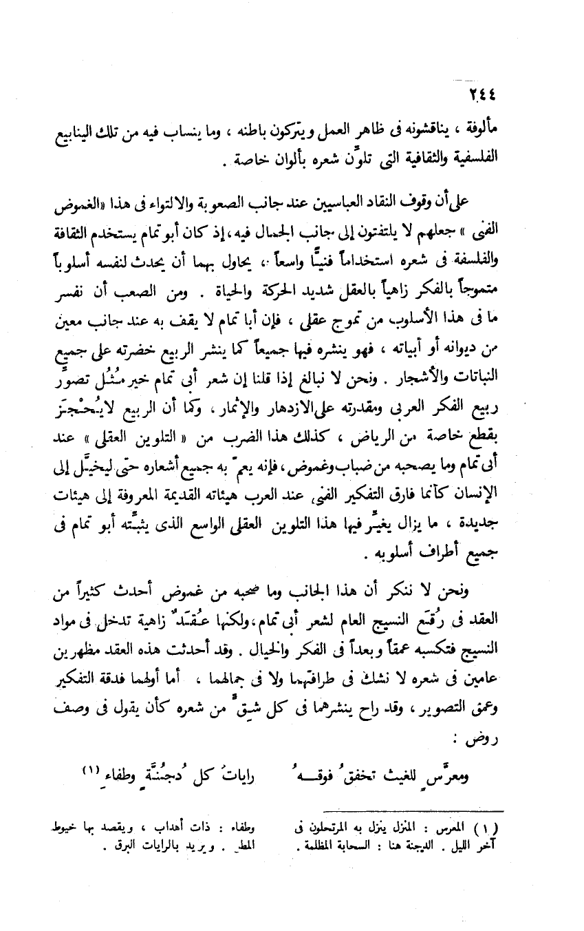 على أن وقوف النقاد العباسيين عند جانب الصعوبة والالتواء في هذا الغموض الفني جعلهم لا يتلفتون إلى جانب الجمال فيه؛ إذ كان أبو تمام يستخدم الثقافة والفلسفة في شعره استخدامًا فنيًّا واسعًا. يحاول بهما أن يحدث لنفسه أسلوبًا متموِّجًا بالفكر زاهيًا بالعقل شديد الحركة والحياة. ومن الصعب أن نفسر ما في هذا الأسلوب من تموج عقلي؛ فإن أبا تمام لا يقف به عند جانب معين من ديوانه أو أبياته، فهو ينشره فيها جميعًا كما ينشر الربيع خضرته على جميع النباتات والأشجار، ونحن لا نبالغ إذا قلنا إن شعر أبي تمام خير مثل تصوِّر ربيع الفكر العربي ومقدرته على الازدهار والإثمار، وكما أن الربيع لا يحجز بقطع خاصة من الرياض، كذلك هذا الضرب من التلوين العقلي عند أبي تمام وما يصحبه من ضباب وغموض، فإنه يعم به جميع أشعاره حتى ليخيل إلى الإنسان كأنما فارق التفكير الفني عند العرب هيئاته القديمة المعروفة إلى هيئات جديدة، ما يزال يغيِّر فيها هذا التلوين العقلي الواسع الذي يثبته أبو تمام في جميع أطراف أسلوبه.