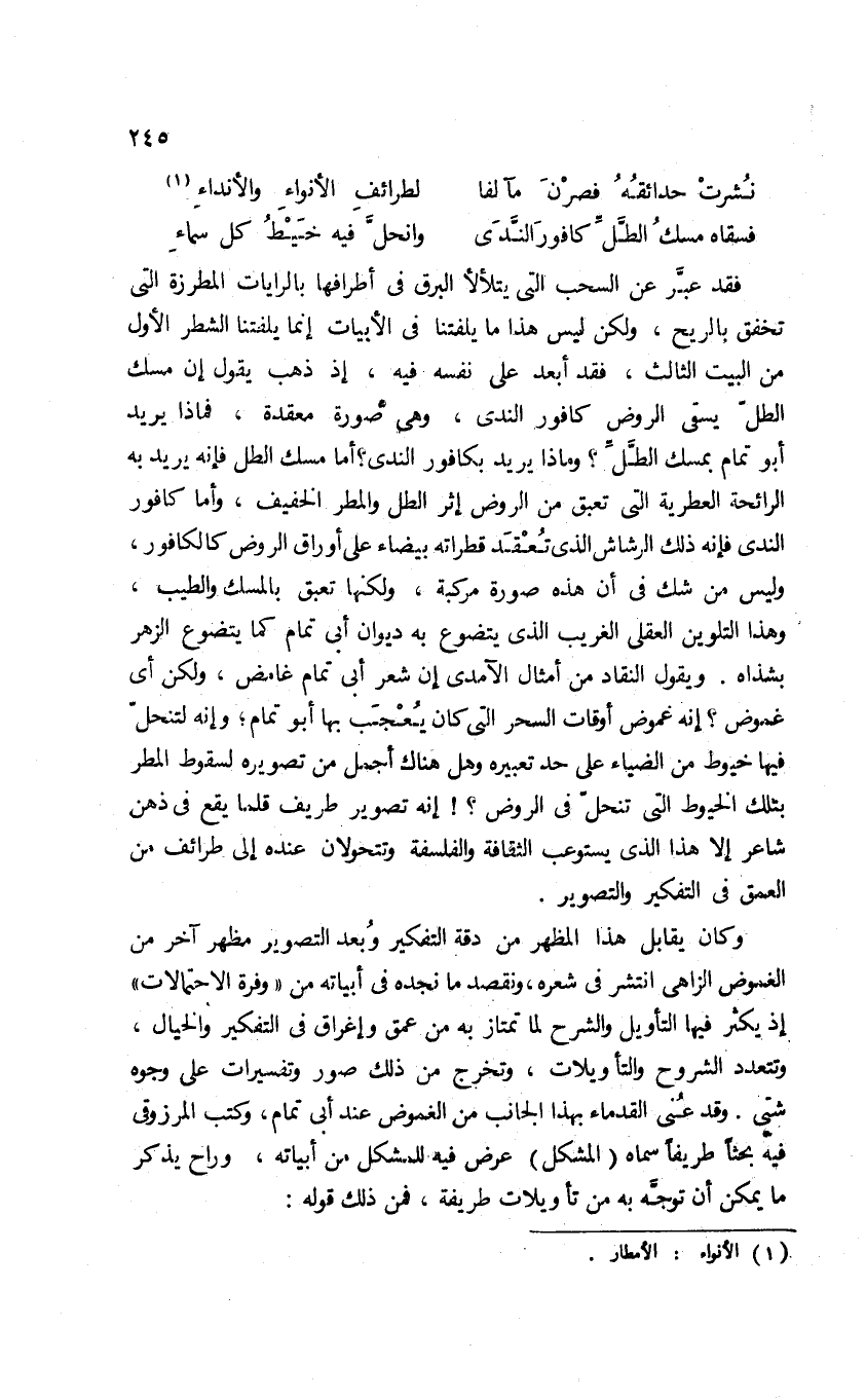 فقد عبَّر عن السحب التي يتلألأ البرق في أطرافها بالرايات المطرزة التي تخفق بالريح؛ ولكن ليس هذا ما يلفتنا في الأبيات إنما يلفتنا الشطر الأول من البيت الثالث؛ فقد أبعد على نفسه فيه؛ إذ ذهب يقول: إن مسك الطل يسقي الروض كافور الندى، وهي صورة معقدة، فماذا يريد أبو تمام بمسك الطلِّ؟ وماذا يريد بكافور الندى؟ أما مسك الطل فإنه يريد به الرائحة العطرية التي تعبق من الروض إثر الطل والمطر الخفيف، وأما كافور الندى فإنه ذلك الرشاش الذي تعقد قطراته بيضاء على أوراق الروض كالكافور، وليس من شك في أن هذه صورة مركبة؛ ولكنها تعبق بالمسك والطيب، وهذا التلوين العقلي الغريب الذي يتضوع به ديوان أبي تمام كما يتضوع الزهر بشذاه. ويقول النقاد من أمثال الآمدي إن شعر أبي تمام غامض، ولكن أي غموض؟ إنه غموض أوقات السحر التي كان يعجب بها أبو تمام؛ وإنه لتنحلّ فيها خيوط من الضياء على حد تعبيره، وهل هناك أجمل من تصويره لسقوط المطر بتلك الخيوط التي تنحل في الروض؟! إنه تصوير طريف قلما يقع في ذهن شاعر إلا هذا الذي يستوعب الثقافة والفلسفة وتتحولان عنده إلى طرائف من العمق في التفكير والتصوير.