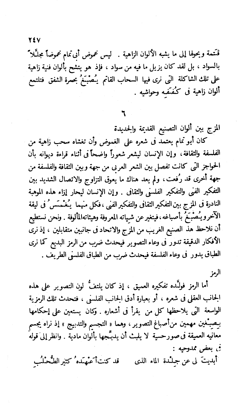 كان أبو تمام يعتمد في شعره على الغموض وإن تغشاه سحب زاهية من الفلسفة والثقافة، وإن الإنسان ليشعر شعورًا واضحًا في أثناء قراءة ديوانه بأن الحواجز التي كانت تفصل بين الشعر العربي من جهة وبين الثقافة والفلسفة من جهة أخرى قد رفعت، ولم يعد هناك ما يعوق التزاوج والاتصال الشديد بين التفكير الفني والتفكير الفلسفي والثقافي. وإن الإنسان ليحار إزاء هذه الموهبة النادرة في المزج بين التفكير الثقافي والتفكير الفني؛ فكل منهما يغمس في ليقة الآخر ويصبغ بأصباغه؛ فيتغير عن شِياته المعروفة وهيئاته المألوفة. ونحن نستطيع أن نلاحظ هذا الصنيع الغريب من المزج والاتحاد في جانبين متقابلين، إذ نرى الأفكار الدقيقة تدور في وعاء التصوير فيحدث ضرب من الرمز البديع كما نرى الطباق يدور في وعاء الفلسفة فيحدث ضرب من الطباق الفلسفي الطريف.