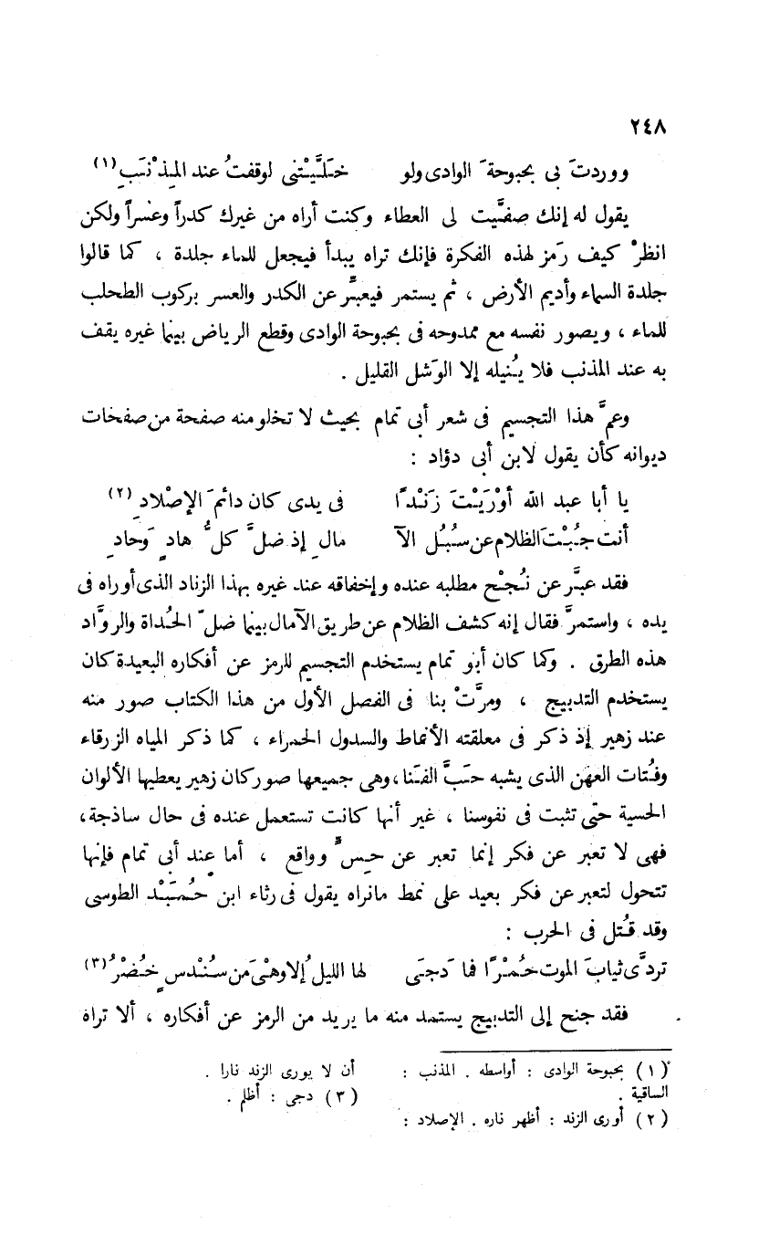 فقد عبر عن نُجْح مطلبه عنده وإخفاقه عند غيره بهذا الزناد الذي أوراه في يده، واستمر فقال: إنه كشف الظلام عن طريق الآمال؛ بينما ضل الحداة والروَّاد هذه الطرق. وكما كان أبو تمام يستخدم التجسيم للرمز عن أفكاره البعيدة كان يستخدم التدبيج، ومرت بنا في الفصل الأول من هذا الكتاب صور منه عند زهير؛ إذ ذكر في معلقته الأنماط والسدول الحمراء، كما ذكر المياه الزرقاء وفتات العهن الذي يشبه حَبَّ الفنا، وهي جميعها صور كان زهير يعطيها الألوان الحسية حتى تثبت في نفوسنا؛ غير أنها كانت تستعمل عنده في حال ساذجة، فهي لا تعبر عن فكر إنما تعبر عن حس وواقع، أما عند أبي تمام فإنها تتحول لتعبر عن فكر بعيد على نمط ما نراه يقول في رثاء ابن حميد الطوسي وقد قتل في الحرب:
