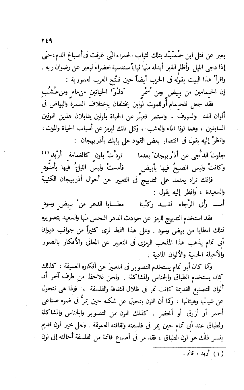 فقد جعل للحِمام أو للموت لونين يختلفان باختلاف السمرة والبياض في ألوان القنا والسيوف، واستمر فعبر عن الحياة بلونين يقابلان هذين اللونين السابقين، وهما لونا الماء والعشب، وكل ذلك ليرمز عن أسباب الحياة والموت، وانظر إليه يقول في انتصار بعض القواد على بابك بأذربيجان: