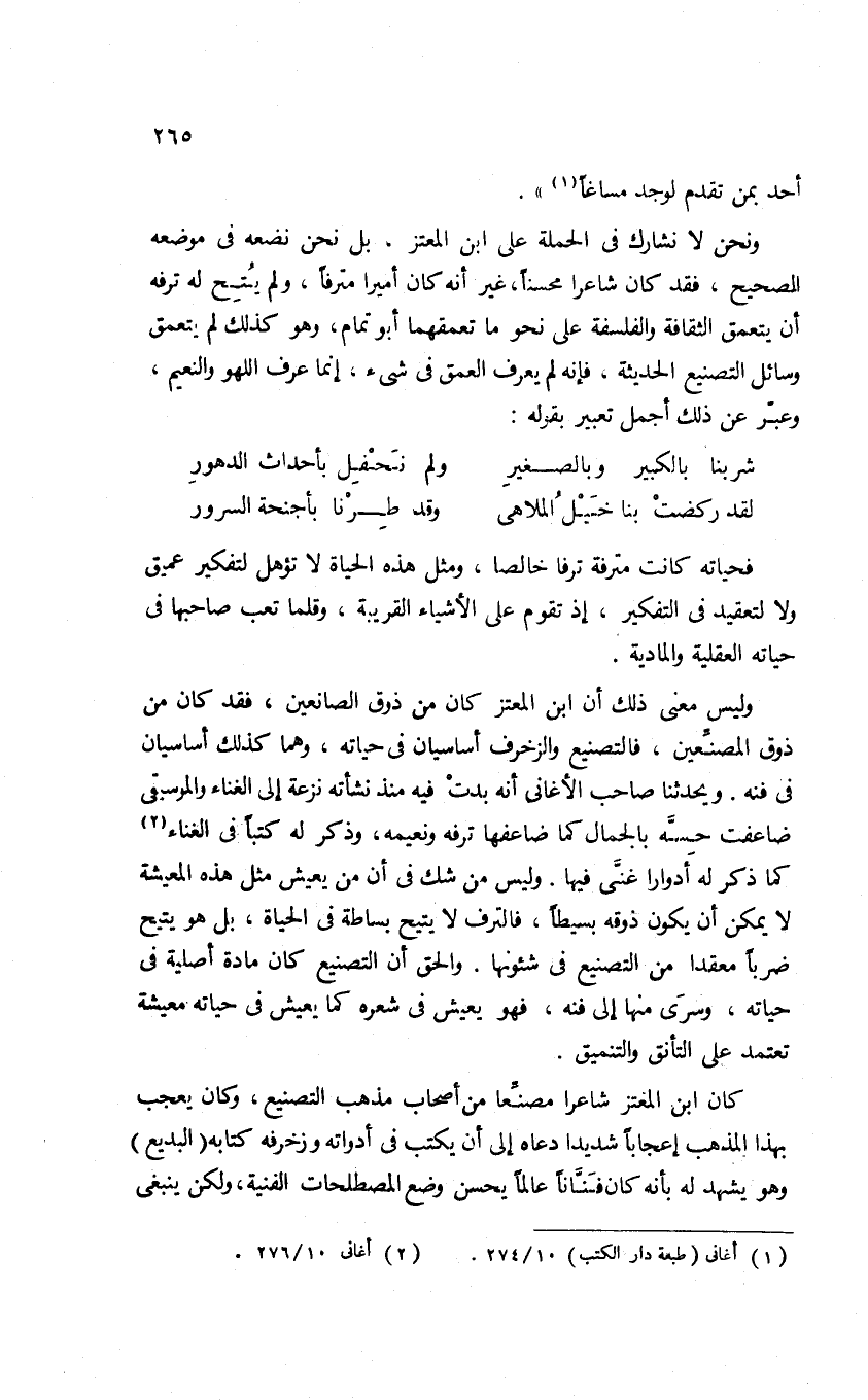 ونحن لا نشارك في الحملة على ابن المعتز؛ بل نحن نضعه في موضوعه الصحيح، فقد كان شاعرًا محسنًا؛ غير أنه كان أميرًا مترفًا، ولم يُتِحْ له ترفه أن يتعمق الثقافة والفلسفة على نحو ما تعمقهما أبو تمام، وهو كذلك لم يتعمق وسائل التصنيع الحديثة، فإنه لم يعرف العمق في شيء؛ إنما عرف اللهو والنعيم، وعبر عن ذلك أجمل تعبير بقوله: