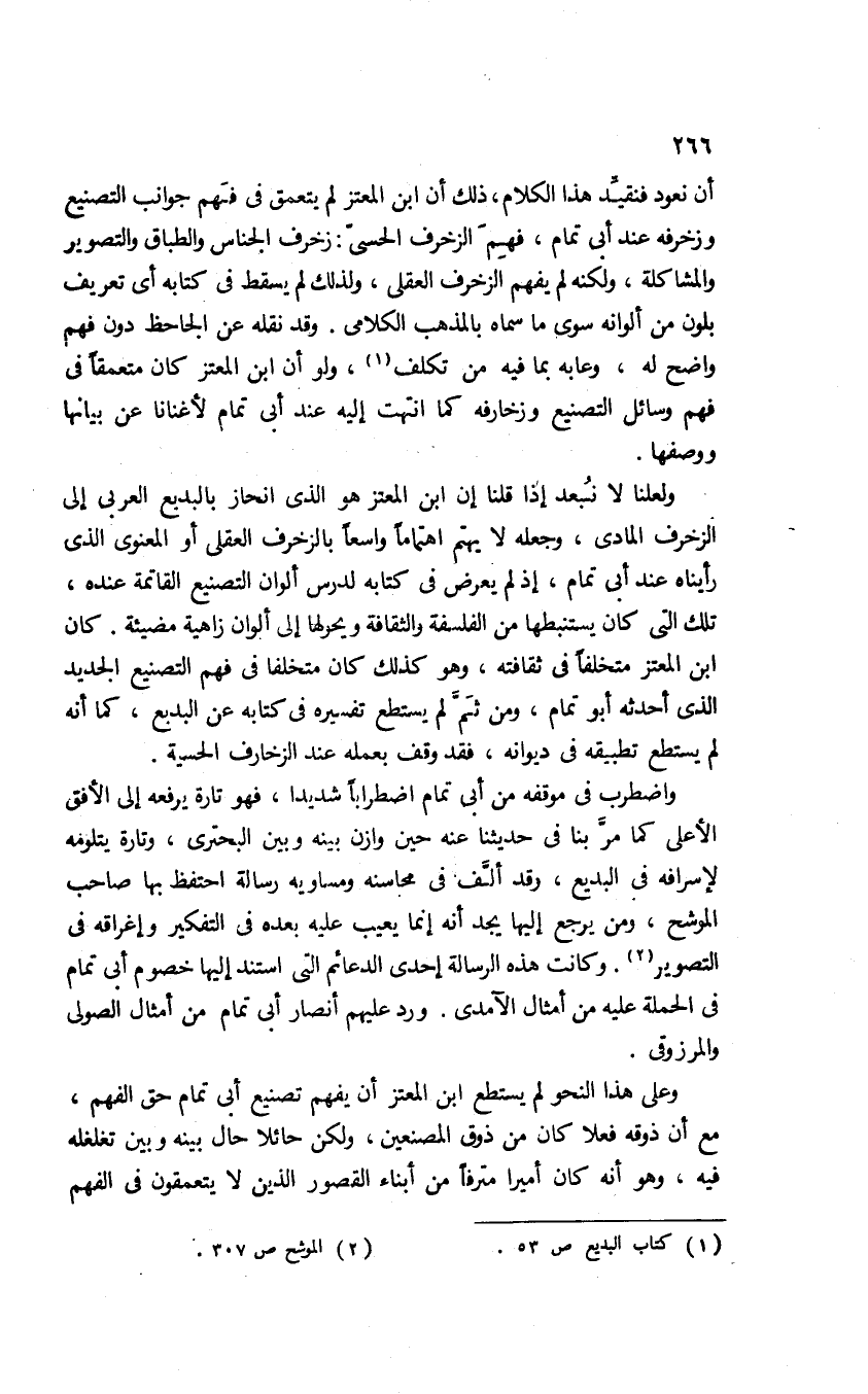 أن نعود فنقيِّد هذا الكلام؛ ذلك أن ابن المعتز لم يتعمق في فهم جوانب التصنيع وزخرفه عند أبي تمام، فهِمَ الزخرف الحسي: زخرف الجناس والطباق والتصوير والمشاكلة، ولكنه لم يفهم الزخرف العقلي، ولذلك لم يسقط في كتابه أي تعريف بلون من ألوانه سوى ما سماه بالمذهب الكلامي. وقد نقله عن الجاحظ دون فهم واضح له، وعابه بما فيه من تكلف1 ولو أن ابن المعتز كان متعمقًا في فهم وسائل التصنيع وزخارفه، كما انتهت إليه عند أبي تمام لأغنانا عن بيانها ووصفها.