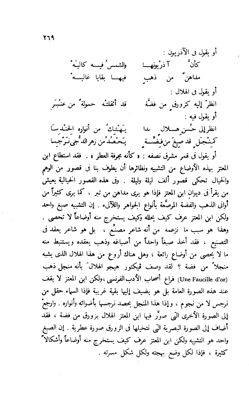 أو يقول في قمر مشرق نصفه: "كأنه مجرفة العطر"؛ فقد استطاع ابن المعتز بهذه الأوضاع من التشبيه ونظائرها أن يطوف بنا في قصور من الوهم والخيال تحكي قصور ألف ليلة وليلة. وفي هذه القصور الخيالية يعيش من يقرأ في ديوان ابن المعتز؛ فإذا هو يرى مداهن من تبر، كما يرى كثيرًا من أواني الذهب والفضة المرصَّعة بأنواع الجواهر واللآلئ. إن التشبيه صبغ واحد ولكن ابن المعتز عرف كيف يحلِّله وكيف يستخرج منه أوضاعًا لا تحصى. وهذا هو سبب ما نزعمه من أنه شاعر مصنِّع؛ بل هو شاعر يعقد في التصنيع، فقد أخذ صبغًا واحدًا من أصباغه وذهب يعقده ويستنبط منه ما لا يحصى من أوضاع رائعة، وهل هناك أروع من هذا الهلال الذي يشبه منجلًا من فضة؟ لقد وصف فيكتور هيجو الهلال بأنه منجل ذهب"UNE FAUCILLE D;OR" فراعَ أصحاب الأدب الفرنسي؛ ولكن ابن المعتز لا يقف عند هذه الصورة العامة بل هو يضيف إليها بقية غريبة فإذا السماء حقل من نرجس لا من نجوم، وإذا هذا المنجل يحصد نرجسها بأضوائه وأنواره، وارجع إلى الصورة الأخرى التي صوَّر فيها ابن المعتز الهلال بزورق من فضة؛ فقد أضاف إلى الصورة البصرية التي نتخيلها في الزورق صورة عطرية، إن الصبغ واحد هو التشبيه ولكن ابن المعتز عرف كيف يستخرج منه أوضاعًا وأشكالًا كثيرة، فإذا لكل وضع بهجته ولكل شكل مسرته.