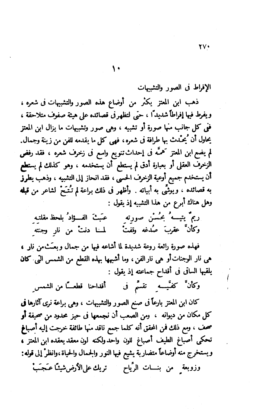 كان ابن المعتز بارعًا في صنع الصور والتشبيهات، وهي براعة نرى آثارها في كل مكان من ديوانه، ومن الصعب أن نجمعها في حيز محدود في صحيفة أو صحف، ومع ذلك فمن المحقق أنه كلما جمع ناقد منها طائفة خرجت إليه أصباغ تحكي أصباغ الطيف أصباغ للون واحد؛ ولكنه لون معقد يعقده ابن المعتز، ويستخرج منه أوضاعًا متضاربة يشيع فيها النور والجمال والحياة، وانظر إلى قوله: