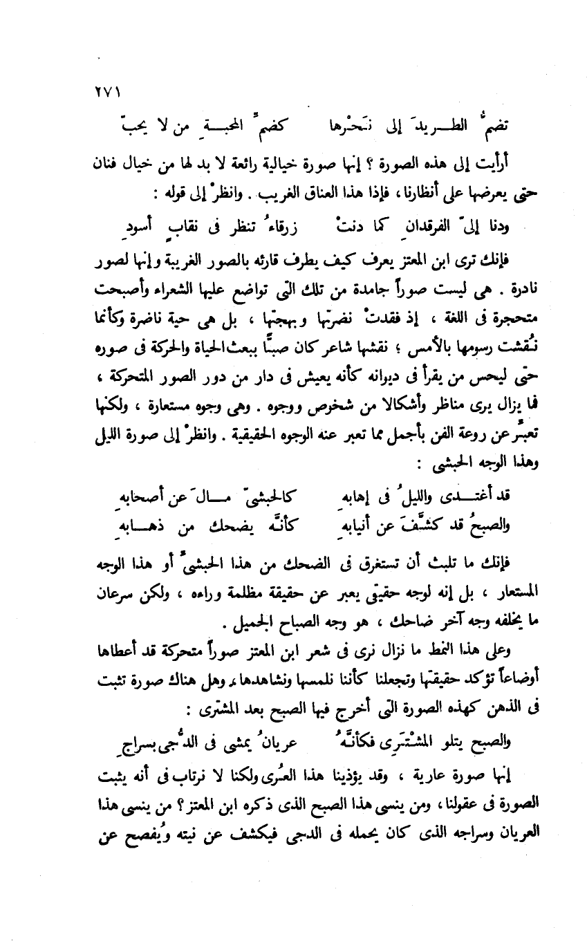 إنها صورة عارية، وقد يؤذينا هذا العري؛ ولكنا لا نرتاب في أنه يثبت الصورة في عقولنا، ومن ينسى هذا الصبح الذي ذكره ابن المعتز؟ من ينسى هذا العريان وسراجه الذي كان يحمله في الدجى فيكشف عن نيته ويفصح عن