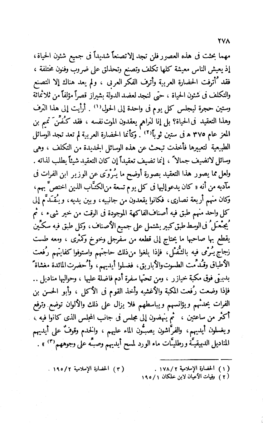 مهما بحثت في هذه العصور فلن تجد إلا تصنعًا شديدًا في جميع شئون الحياة؛ إذ يعيش الناس معيشة كلها تكلف وتصنع وتحذلق على ضروب وفنون مختلفة، فقد أترفت الحضارة العربية وأترف الفكر العربي، ولم يعد هناك إلا التصنع والتكلف في شئون الحياة، حتى لنجد لعضد الدولة بشيراز قصرًا مؤلفًا من ثلاثمائة وستين حجرة ليجلس كل يوم في واحدة إلى الحول1. أرأيت إلى هذا الترف وهذا التعقيد في الحياة؟ بل إنا لنراهم يعقدون الموت نفسه؛ فقد كفِّن تميم بن المعز عام 375هـ في ستين ثوبًا2. وكأنما الحضارة العربية لم تعد تجد الوسائل الطبيعية لتعبيرها فأخذت تبحث عن الوسائل الجديدة من التكلف، وهي وسائل لا تضيف جمالًا، إنما تضيف تعقيدًا إن كان التعقيد شيئًا يطلب لذاته.