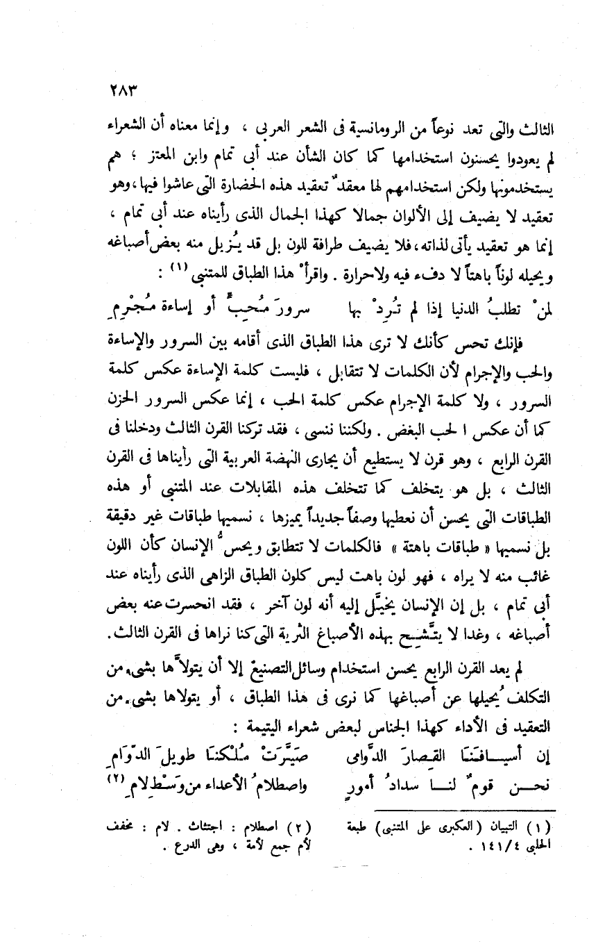الثالث، والتي تعد نوعًا من الرومانسية في الشعر العربي؛ وإنما معناه أن الشعراء لم يعودوا يحسنون استخدامها كما كان الشأن عند أبي تمام وابن المعتز؛ هم يستخدمونها ولكن استخدامهم لها معقد تعقيد هذه الحضارة التي عاشوا فيها، وهو تعقيد لا يضيف إلى الألوان جمالًا كهذا الجمال الذي رأيناه عند أبي تمام إنما هو تعقيد يأتي لذاته؛ فلا يضيف طرافة للون بل قد يزيل منه بعض أصباغه ويحيله لونًا باهتًا لا دفء فيه ولا حرارة. واقرأ هذا الطباق للمتنبي.