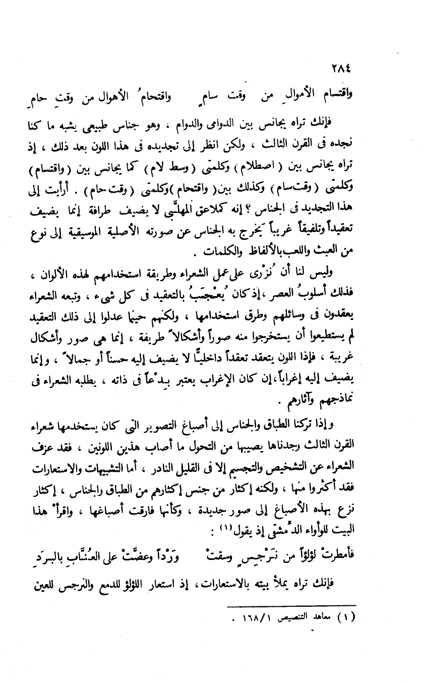 وإذا تركنا الطباق والجناس إلى أصباغ التصوير التي كان يستخدمها شعراء القرن الثالث وجدناها يصيبها من التحول ما أصاب هذين اللونين؛ فقد عزف الشعراء عن التشخيص والتجسيم إلا في القليل النادر، أما التشبيهات والاستعارات فقد أكثروا منها، ولكنه إكثار من جنس إكثارهم من الطباق والجناس، إكثار نزع بهذه الأصباغ إلى صور جديدة، وكأنها فارقت أصباغها، واقرأ هذا البيت للوأواء الدمشقي إذ يقول1: