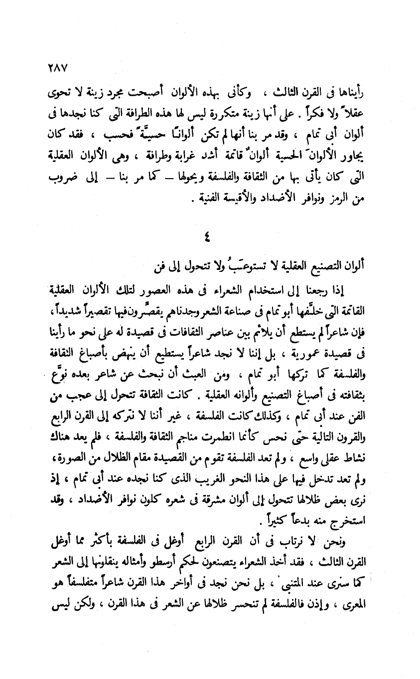 رأيناها في القرن الثالث، وكأني بهذه الألوان أصبحت مجرد زينة لا تحوي عقلًا ولا فكرًا. على أنها زينة متكررة ليس لها هذه الطرافة التي كنا نجدها في ألوان أبي تمام. وقد مر بنا أنها لم تكن ألوانًا حسية فحسب؛ فقد كان يجاور الألوان الحسية ألوان قاتمة أشد غرابة وطرافة، وهي الألوان العقلية التي كان يأتي بها من الثقافة والفلسفة ويحولها -كما مر بنا- إلى ضروب من الرمز ونوافر الأضداد والأقيسة الفنية.