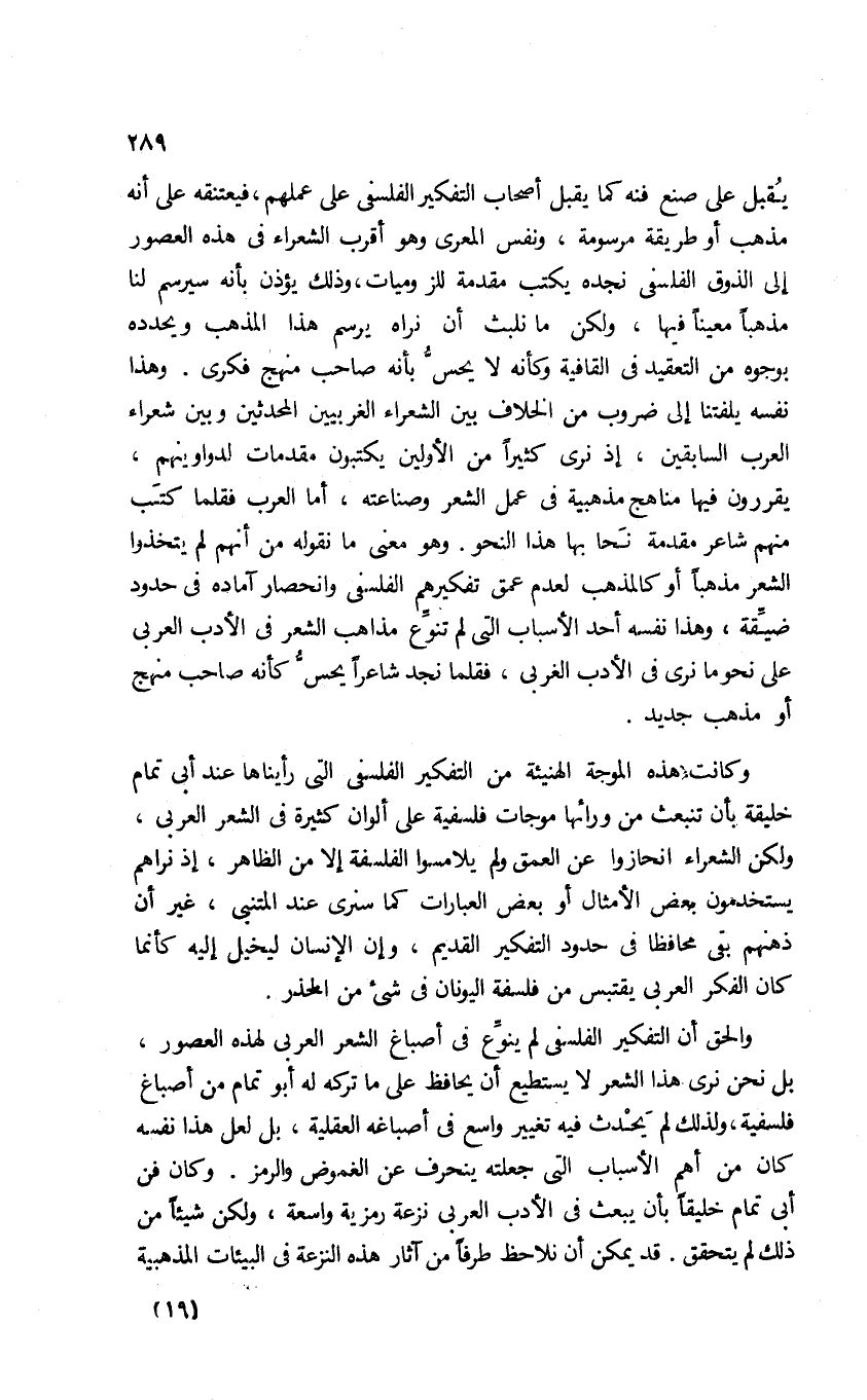 يقبل على صنع فنه كما يقبل أصحاب التفكير الفلسفي على عملهم، فيعتنقه على أنه مذهب أو طريقة مرسومة، ونفس المعري وهو أقرب الشعراء في هذه العصور إلى الذوق الفلسفي نجده يكتب مقدمة للزوميات؛ وذلك يؤذن بأنه سيرسم لنا مذهبًا معينًا فيها، ولكن ما نلبث أن نراه يرسم هذا المذهب ويحدده بوجوه من التعقيد في القافية وكأنه لا يحس بأنه صاحب منهج فكري. وهذا نفسه يلفتنا إلى ضروب من الخلاف بين الشعراء الغربيين المحدثين وبين شعراء العرب السابقين؛ إذ نرى كثيرًا من الأولين يكتبون مقدمات لدواوينهم، يقررون فيها مناهج مذهبية في عمل الشعر وصناعته، أما العرب فقلما كتب منهم شاعر مقدمة نحا بها هذا النحو، وهو معنى ما نقوله من أنهم لم يتخذوا الشعر مذهبًا أو كالمذهب لعدم عمق تفكيرهم الفلسفي وانحصار آماده في حدود ضيقة، وهذا نفسه أحد الأسباب التي لم تنوع مذاهب الشعر في الأدب العربي على نحو ما نرى في الأدب الغربي؛ فقلما نجد شاعرًا يحس كأنه صاحب منهج أو مذهب جديد.