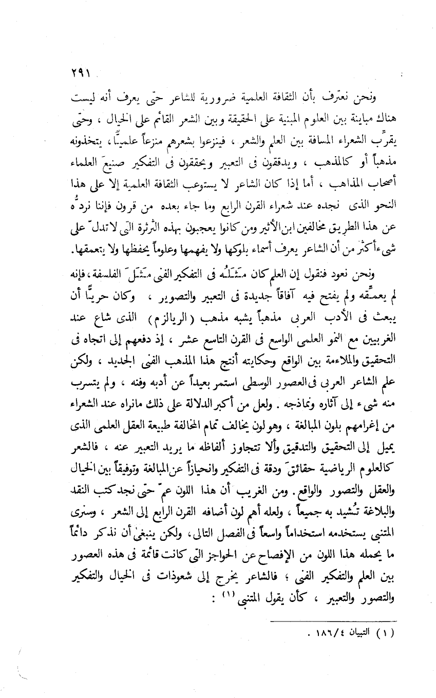 ونحن نعود فنقول: إن العلم كان مِثْلُه في التفكير الفني مثل الفلسفة؛ فإنه لم يعمِّقه ولم يفتح فيه أفاقًا جديدة في التعبير والتصوير، وكان حريًّا أن يبعث في الأدب العربي مذهبًا يشبه مذهب "الريالزم" الذي شاع عند الغربيين مع النمو العلمي الواسع في القرن التاسع عشر؛ إذ دفعهم إلى اتجاه في التحقيق والملاءمة بين الواقع وحكايته أنتج هذا المذهب الفني الجديد؛ ولكن علم الشاعر العربي في العصور الوسطى استمر بعيدا عن أدبه وفنه، ولم يتسرب منه شيء إلى آثاره ونماذجه. ولعل من أكبر الدلالة على ذلك ما نراه عند الشعراء من إغرامهم بلون المبالغة، وهو لون يخالف تمام المخالفة طبيعة العقل العلمي الذي يميل إلى التحقق والتدقيق وألا تتجاوز ألفاظه ما يريد التعبير عنه، فالشعر كالعلوم الرياضية حقائق ودقة في التفكير وانحيازًا عن المبالغة وتوفيقًا بين الخيال والعقل والتصور والواقع. ومن الغريب أن هذا اللون عم حتى نجد كتب النقد والبلاغة تشيد به جميعًا، ولعله أهم لون أضافه القرن الرابع إلى الشعر، وسنرى المتنبي يستخدمه استخدامًا واسعًا في الفصل التالي؛ ولكن ينبغي أن نذكر دائمًا ما يحمله هذا اللون من الإفصاح عن الحواجز التي كانت قائمة في هذه العصور بين العلم والتفكير الفني؛ فالشاعر يخرج إلى شعوذات في الخيال والتفكير والتصور والتعبير، كأن يقول المتنبي1: