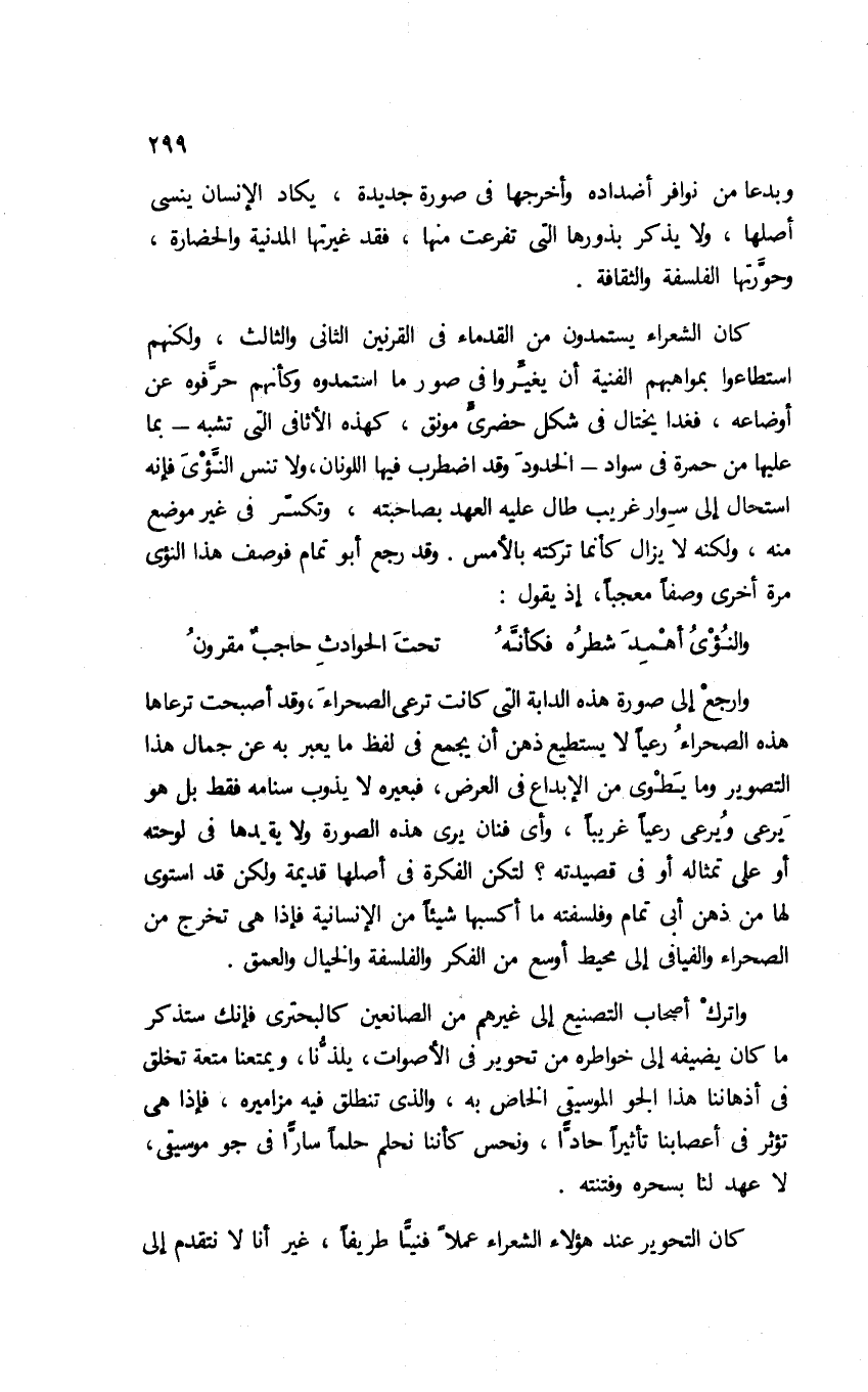 واترك أصحاب التصنيع إلى غيرهم من الصانعين كالبحتري فإنك ستذكر ما كان يضيفه إلى خواطره من تحوير في الأصوات، يلذُّنا، ويمتعنا متعة تخلق في أذهاننا هذا الجو الموسيقى الخاص به، والذي تنطق فيه مزاميره؛ فإذا هي تؤثر في أعصابنا تأثيرًا حادًّا، ونحسن كأننا نحلم حلمًا سارًّا في جو موسيقي، لا عهد لنا بسحره وفتنته.