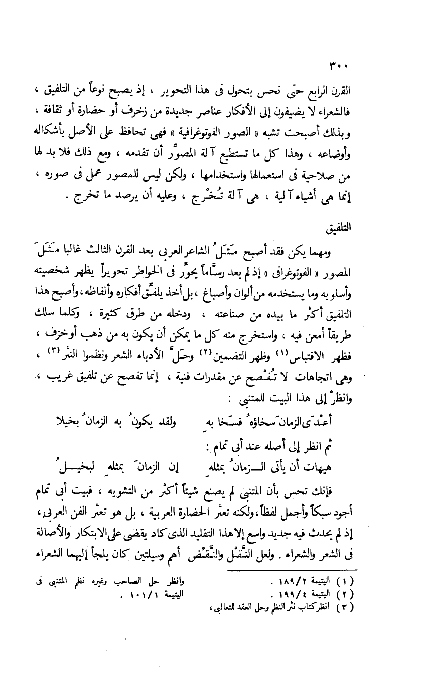 القرن الرابع حتى نحس بتحول في هذا التحوير؛ إذ يصبح نوعًا من التلفيق، فالشعراء لا يضيفون إلى الأفكار عناصر جديدة من زخرف أو حضارة أو ثقافة، وبذلك أصبحت تشبه "الصور الفوتوغرافية" فهي تحافظ على الأصل بأشكاله وأوضاعه، وهذا كل ما تستطيع آلة المصوَّر أن تقدمه، ومع ذلك فلا بد لها من صلاحية في استعمالها واستخدامها؛ ولكن ليس للمصور عمل في صوره، إنما هي أشياء آلية، هي آلة تُخرج، وعليه أن يرصد ما تخرج.