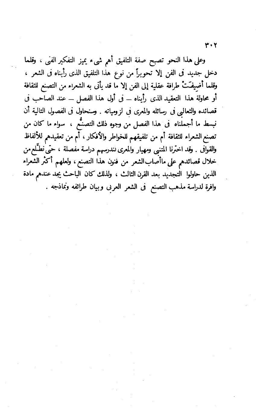 وعلى هذا النحو تصبح صفة التلفيق أهم شيء يميز التفكير الفني، وقلما دخل جديد في الفن إلا تحويرًا من نوع هذا التلفيق الذي رأيناه في الشعر، وقلما أضيفت طرافة عقلية إلى الفن إلا ما قد يأتي به الشعراء من التصنع للثقافة أو محاولة هذا التعقيد الذي رأيناه -في أول هذا الفصل- عند الصاحب في قصائده، والثعالبي في رسائله، والمعري في لزومياته. وسنحاول في الفصول التالية أن نبسط ما أجملناه في هذا الفصل من وجوه ذلك التصنع؛ سواء ما كان من تصنع الشعراء للثقافة أم من تلفيقهم للخواطر والأفكار، أم من تعقيدهم للألفاظ والقوافي. وقد اخترنا المتنبي ومهيار والمعري لندرسهم دراسة مفصلة، حتى نطَّلع من خلال قصائدهم على ما أصاب الشعر من فنون هذا التصنع، ولعلهم أكثر الشعراء الذين حاولوا التجديد بعد القرن الثالث، ولذلك كان الباحث يجد عندهم مادة وافرة لدراسة مذهب التصنع في الشعر العربي وبيان طرائفه ونماذجه.