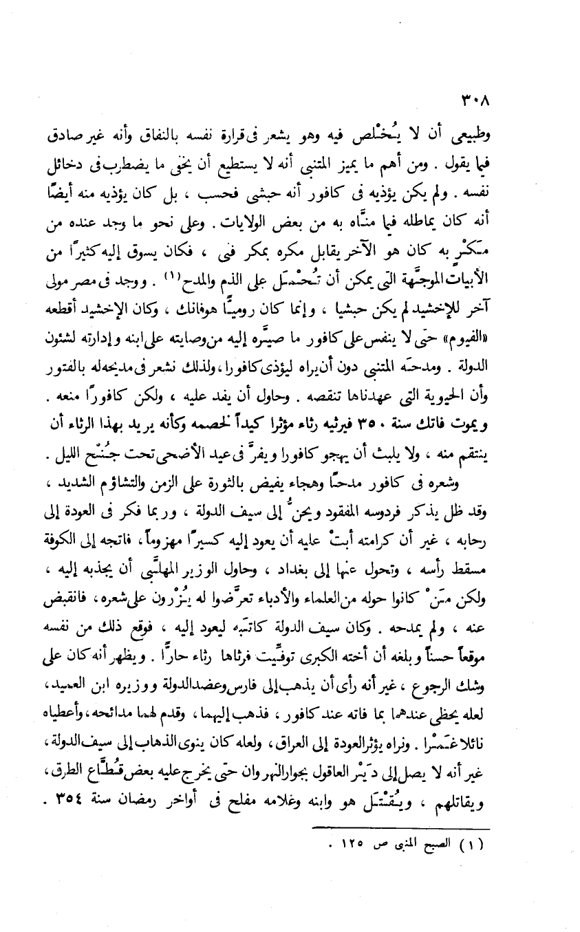 وشعره في كافور مدحًا وهجاء يفيض بالثورة على الزمن والتشاؤم الشديد، وقد ظل يذكر فردوسه المفقود ويحن إلى سيف الدولة، وربما فكر في العودة إلى رحابه؛ غير أن كرامته أبت عليه أن يعود إليه كسيرًا مهزومًا؛ فاتجه إلى الكوفة مسقط رأسه، وتحول عنها إلى بغداد، وحاول الوزير المهلبي أن يجذبه إليه، ولكن من كانوا حوله من العلماء والأدباء تعرضوا له يُزْرون على شعره، فانقبض عنه، ولم يمدحه. وكان سيف الدولة كاتبه ليعود إليه، فوقع ذلك من نفسه موقعًا حسنًا وبلغه أن أخته الكبرى توفيت فرثاها رثاءً حارًّا. ويظهر أنه كان على وشك الرجوع؛ غير أنه رأى أن يذهب إلى فارس وعضد الدولة ووزيره ابن العميد، لعله يحظى عندهما بما فاته عند كافور، فذهب إليهما، وقدم لهما مدائحه، وأعطياه نائلًا غمرًا، ونراه يؤثر العودة إلى العراق، ولعله كان ينوي الذهاب إلى سيف الدولة؛ غير أنه لا يصل إلى دير العاقول بجوار النهروان حتى يخرج عليه بعض قطاع الطرق، ويقاتلهم، ويُقتل هو وابنه وغلامه مفلح في أواخر رمضان سنة 354.