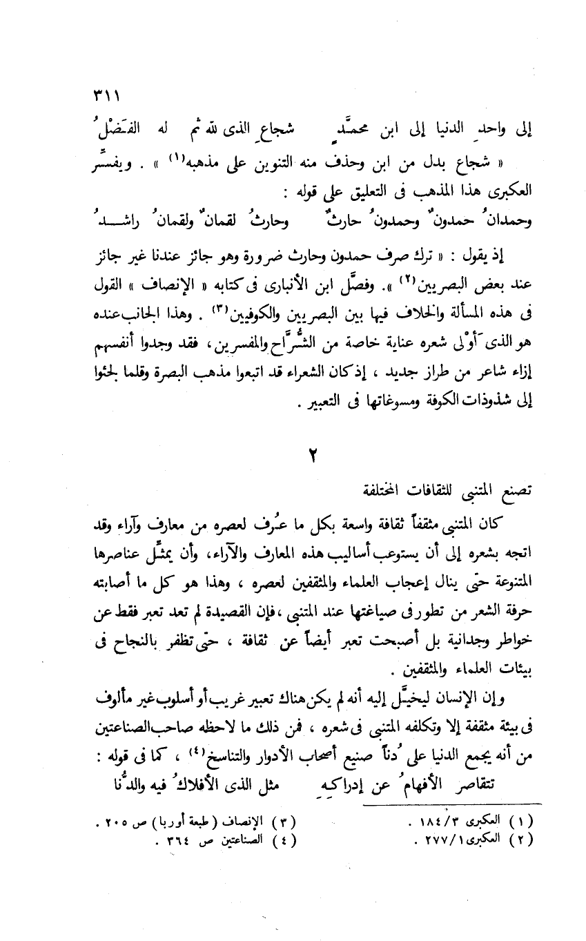 وإن الإنسان ليخيل إليه أنه لم يكن هناك تعبير غريب أو أسلوب غير مألوف في بيئة مثقفة إلا وتكلّفه المتنبي في شعره؛ فمن ذلك ما لاحظه صاحب الصناعتين من أنه يجمع "الدنيا" على "دنا" صنيع أصحاب الأدوار والتناسخ1، كما في قوله: