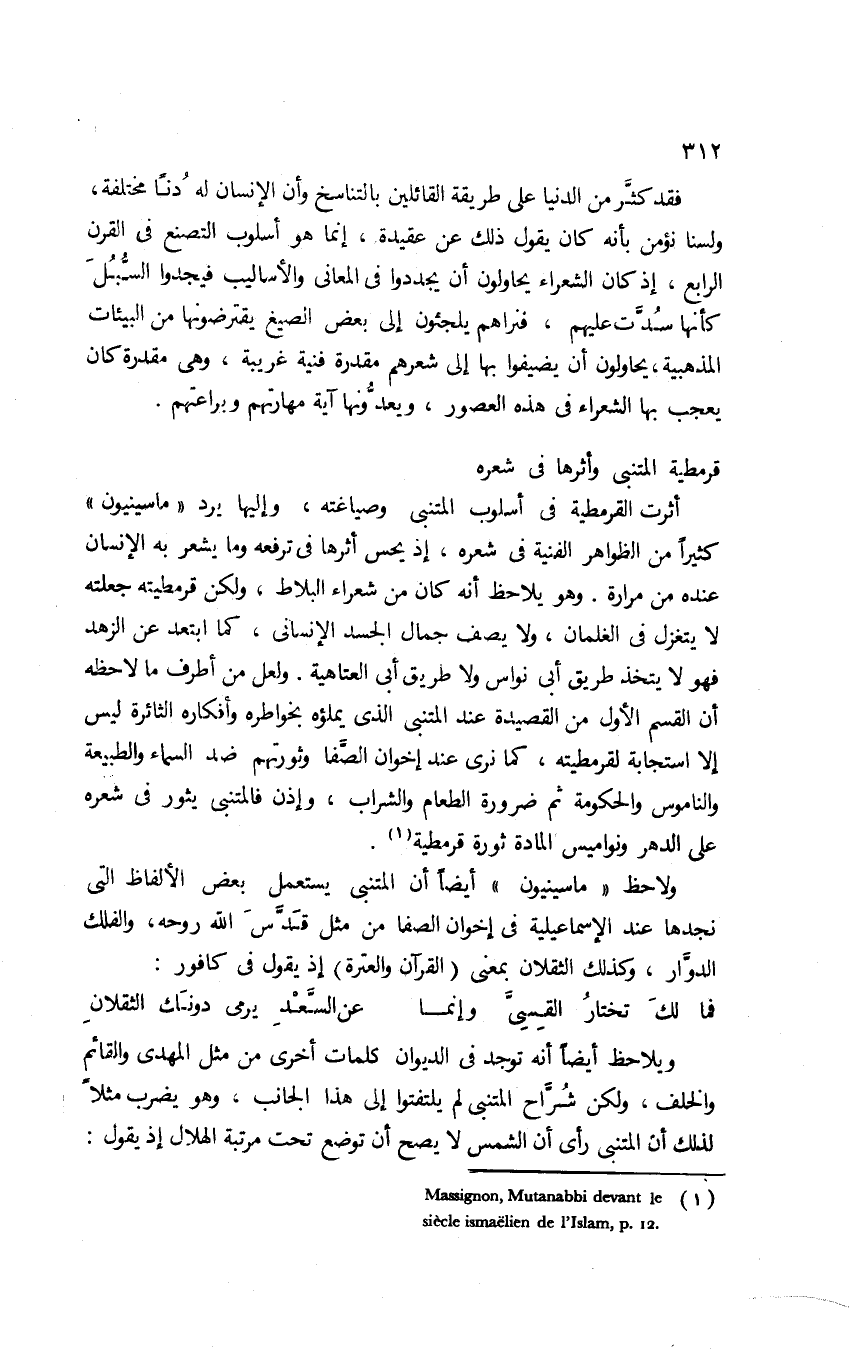 1 MASSIGNON, MUTANABBI DEVANT IE SIECLE ISMAELIEN DE I;ISLAM, P.12.