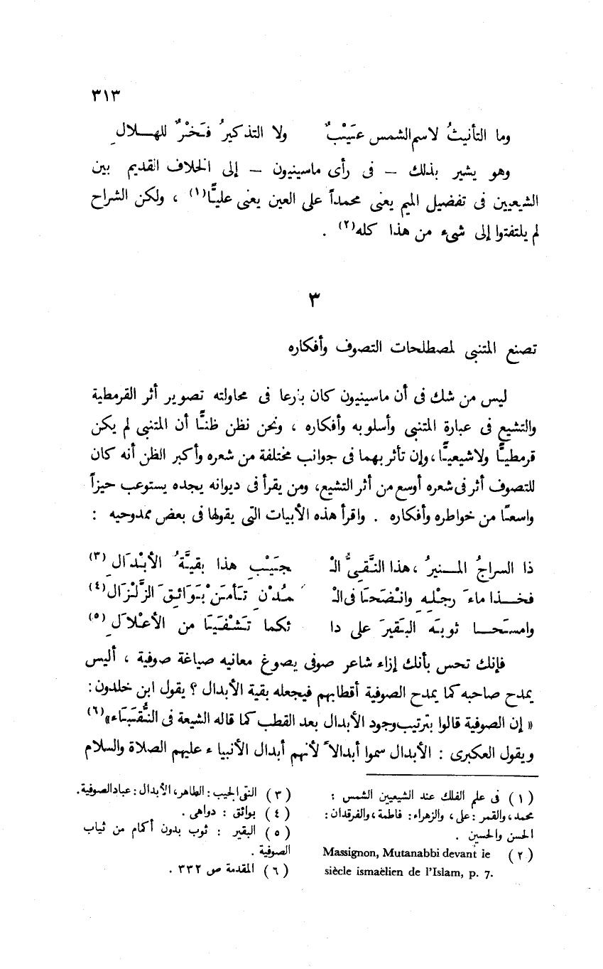 ليس من شك في أن ماسينيون كان بارعًا في محاولته تصوير أثر القرمطية والتشيع في عبارة المتنبي وأسلوبه وأفكاره، ونحن نظن ظنًّا أن المتنبي لم يكن قرمطيًّا ولا شيعيًّا، وإن تأثر بهما في جوانب مختلفة من شعره وأكبر الظن أنه كان للتصوف أثر في شعره أوسع من أثر التشيع، ومن يقرأ في ديوانه يجده يستوعب حيزًا واسعًا من خواطره وأفكاره. واقرأ هذه الأبيات التي يقولها في بعض ممدوحيه:
