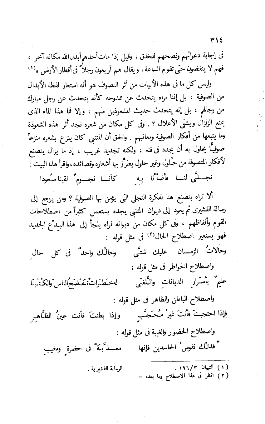 ألا تراه يتصنع هنا لفكرة التجلي التي يؤمن بها الصوفية؟ ومن يرجع إلى رسالة القشيري ثم يعود إلى ديوان المتنبي يجده يستعمل كثيرًا من اصطلاحات القوم وألفاظهم، وفي كل مكان من ديوانه نراه يلجأ إلى هذا البِدْع الجديد فهو يستعير اصطلاح الحال2 في مثل قوله:
