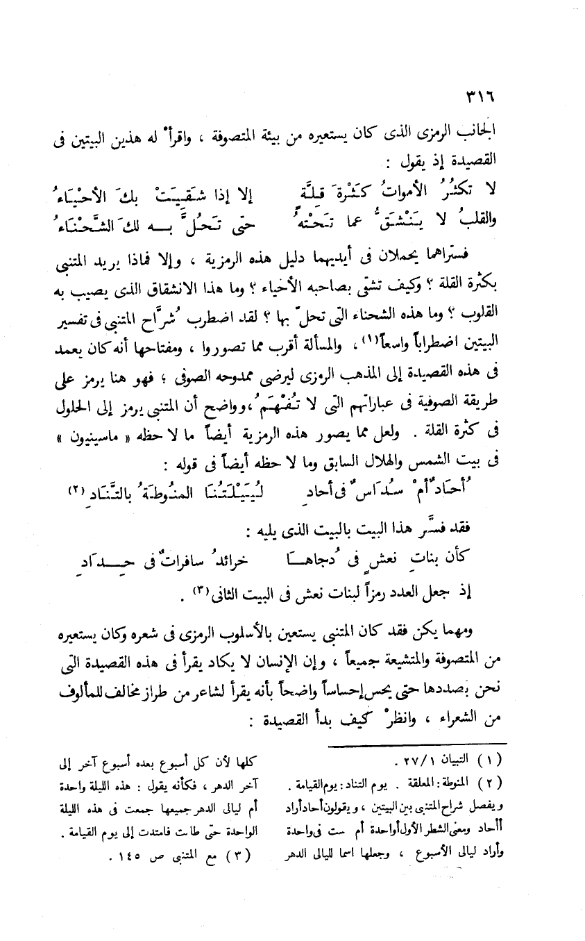 فستراهما يحملان في أيديهما دليل هذه الرمزية، وإلا فماذا يريد المتنبي بكثرة القلة؟ وكيف تشقى بصاحبه الأحياء؟ وما هذا الانشقاق الذي يصيب به القلوب؟ وما هذه الشحناء التي تحل بها؟ لقد اضطرب شراح المتنبي في تفسير البيتين اضطرابًا واسعًا1، والمسألة أقرب مما تصوروا، ومفتاحها أنه كان يعمد في هذه القصيدة إلى المذهب الرمزي ليرضي ممدوحه الصوفي فهو هنا يرمز على طريقة الصوفية في عباراتهم التي لا تفهم، وواضح أن المتنبي يرمز إلى الحلول في كثرة القلة. ولعل مما يصور هذه الرمزية أيضًا ما لاحظه "ماسينيون" في بيت الشمس والهلال السابق وما لاحظه أيضًا في قوله: