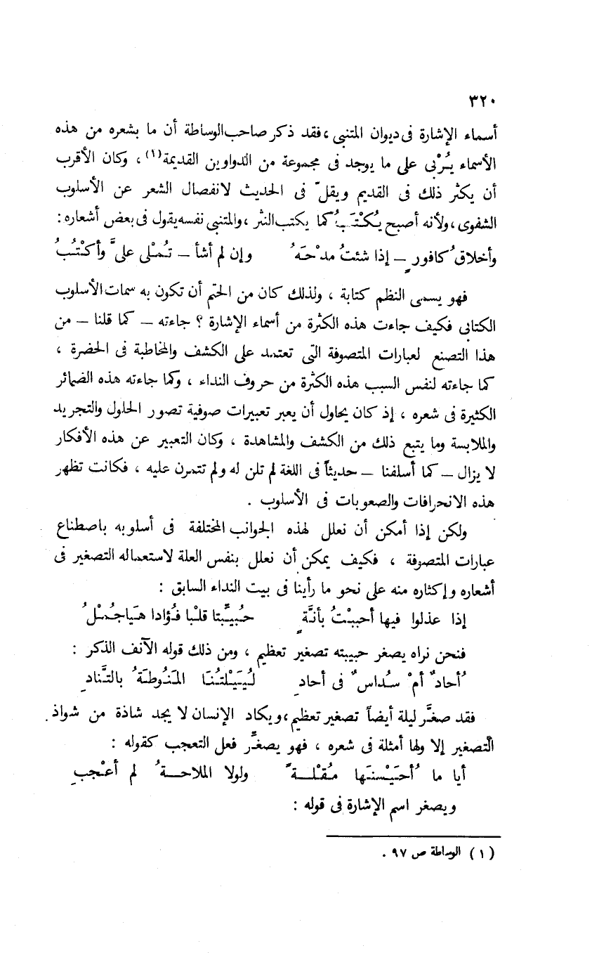 أسماء الإشارة في ديوان المتنبي؛ فقد ذكر صاحب الوساطة أن ما بشعره من هذه الأسماء يربي على ما يوجد في مجموعة من الدواوين القديمة1 وكان الأقرب أن يكثر ذلك في القديم ويقلّ في الحديث لانفصال الشعر عن الأسلوب الشفوي، ولأنه أصبح يكتب كما يكتب النثر، والمتنبي نفسه يقول في بعض أشعاره: