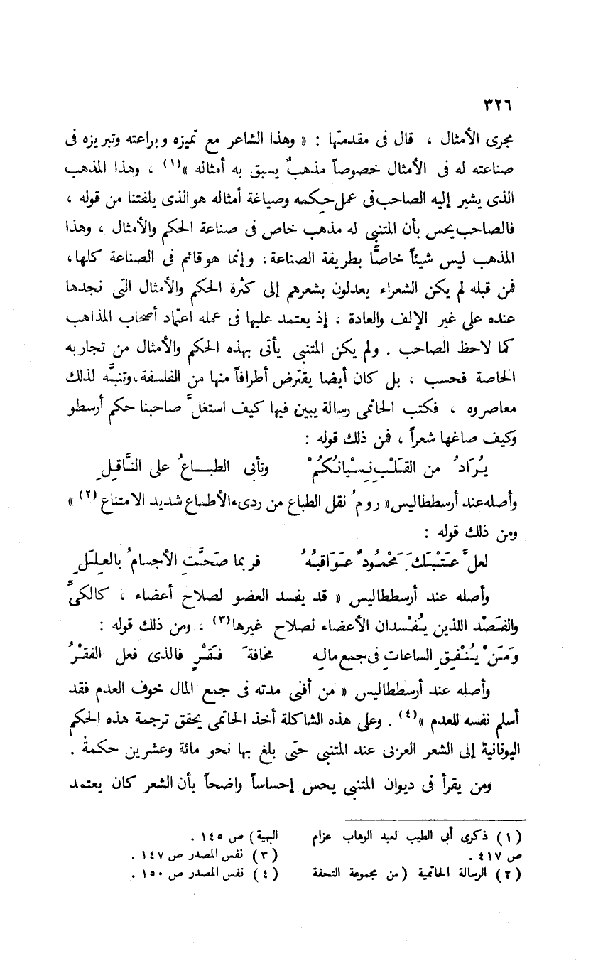 وأصله عند أرسططاليس: "من أفنى مدته في جمع المال خوف العدم فقد أسلم نفسه للعدم"4. وعلى هذه الشاكلة أخذ الحاتمي يحقق ترجمة هذه الحكم اليونانية إلى الشعر العربي عند المتنبي حتى بلغ بها نحو مائة وعشرين حكمة.