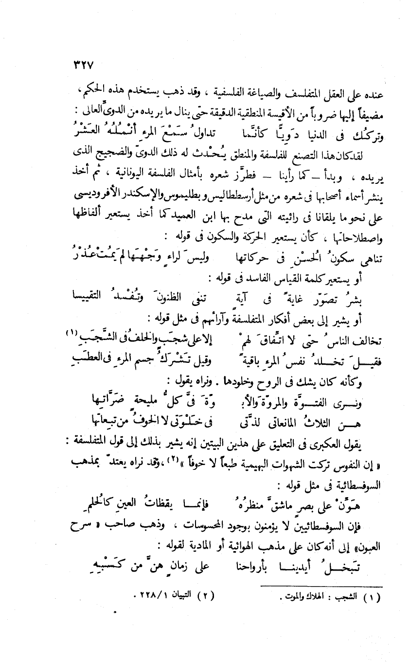 يقول العُكْبَري في التعليق على هذين البيتين: إنه يشير بذلك إلى قول المتفلسفة: "إن النفوس تركت الشهوات البهيمية طبعًا لا خوفًا"2، وقد نراه يعتد بمذهب السوفسطائية في مثل قوله: