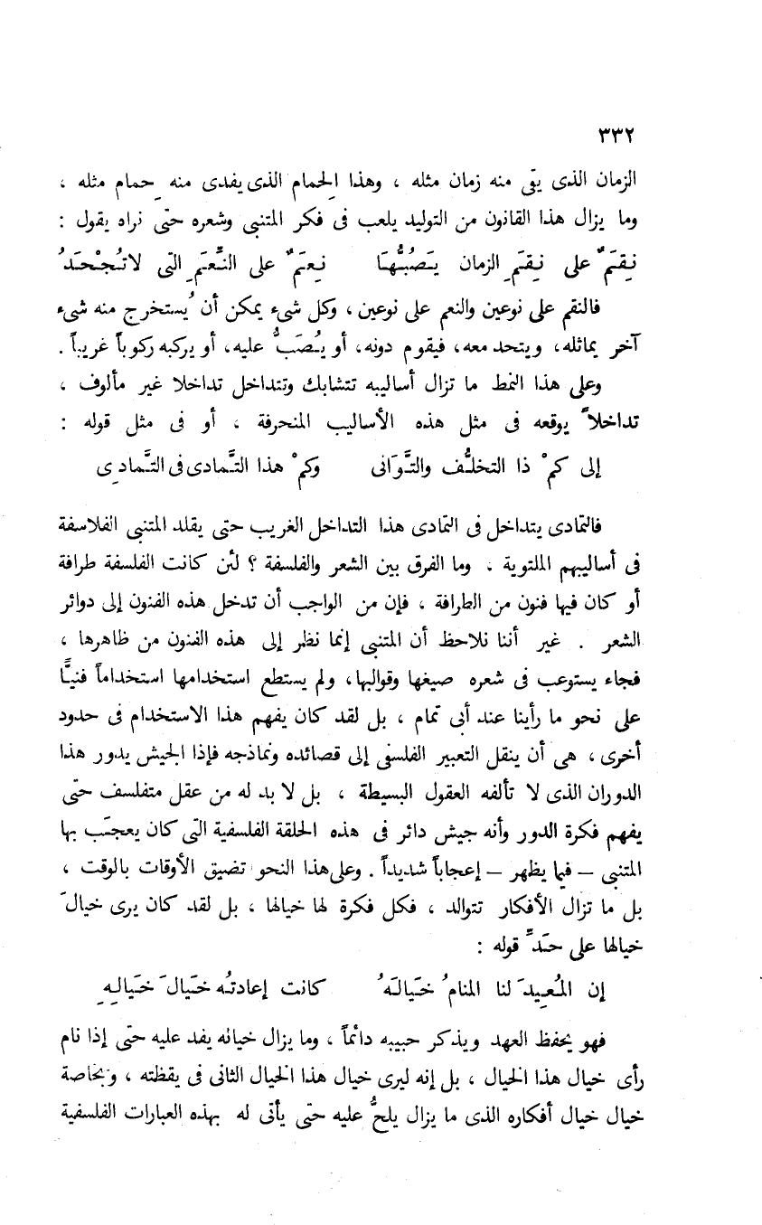 فالتمادي يتداخل في التمادي هذا التداخل الغريب حتى يقلد المتنبي الفلاسفة في أساليبهم الملتوية، وما الفرق بين الشعر والفلسفة؟ لئن كانت الفلسفة طرافة أو كان فيها فنون من الطرافة، فإن من الواجب أن تدخل هذه الفنون إلى دوائر الشعر؛ غير أننا نلاحظ أن المتنبي إنما نظر إلى هذه الفنون من ظاهرها، فجاء يستوعب في شعره صيغها وقوالبها، ولم يستطع استخدامها استخدامًا فنيًّا على نحو ما رأينا عند أبي تمام؛ بل لقد كان يفهم هذا الاستخدام في حدود أخرى، هي أن ينقل التعبير الفلسفي إلى قصائده ونماذجه فإذا الجيش يدور هذا الدوران الذي لا تألفه العقول البسيطة، بل لا بد له من عقل متفلسف حتى يفهم فكرة الدور وأنه جيش دائر في هذه الحلقة الفلسفية التي كان يعجب بها المتنبي-فيم يظهر- إعجابًا شديدًا. وعلى هذا النحو تضيق الأوقات بالوقت، بل ما تزال الأفكار تتوالد، فكل فكرة لها خيالها، بل لقد كان يرى خيال خيالها على حد قوله: