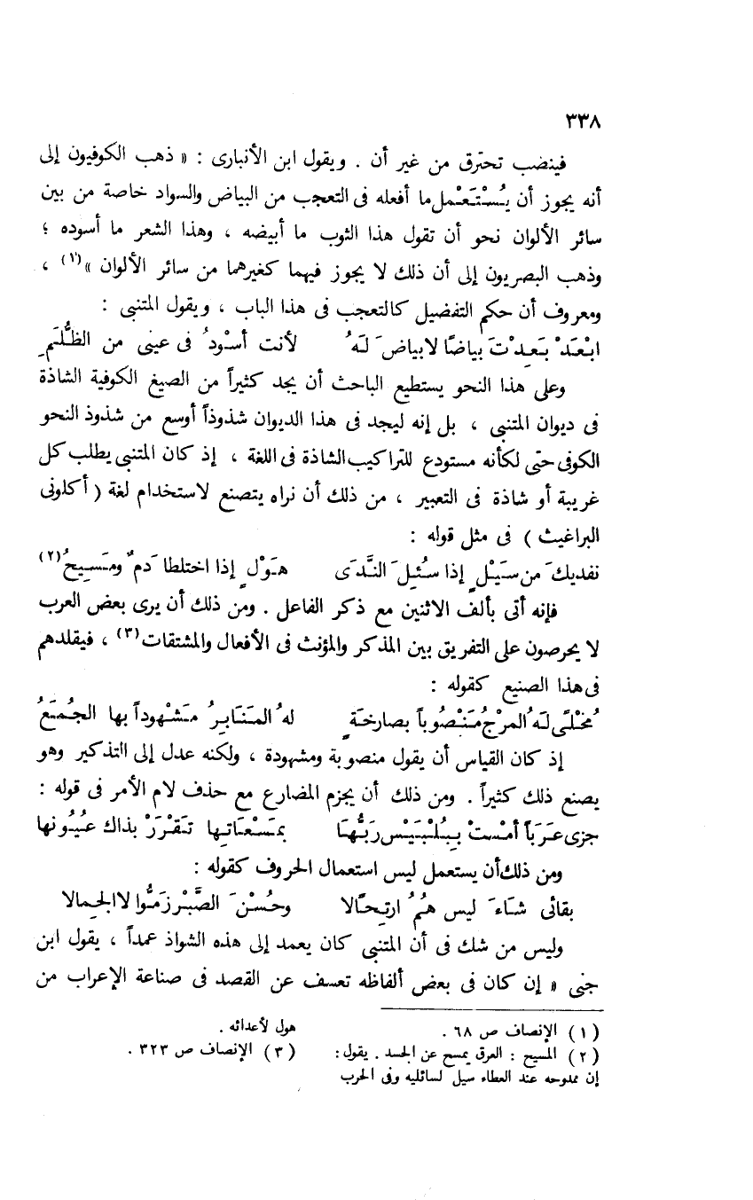 وعلى هذا النحو يستطيع الباحث أن يجد كثيرًا من الصيغ الكوفية الشاذة في ديوان المتنبي؛ بل إنه ليجد في هذا الديوان شذوذًا أوسع من شذوذ النحو الكوفي حتى لكأنه مستودع للتراكيب الشاذة في اللغة؛ إذ كان المتنبي يطلب كل غريبة أو شاذة في التعبير، من ذلك أن نراه يتصنع لاستخدام لغة "أكلوني البراغيث" في مثل قوله: