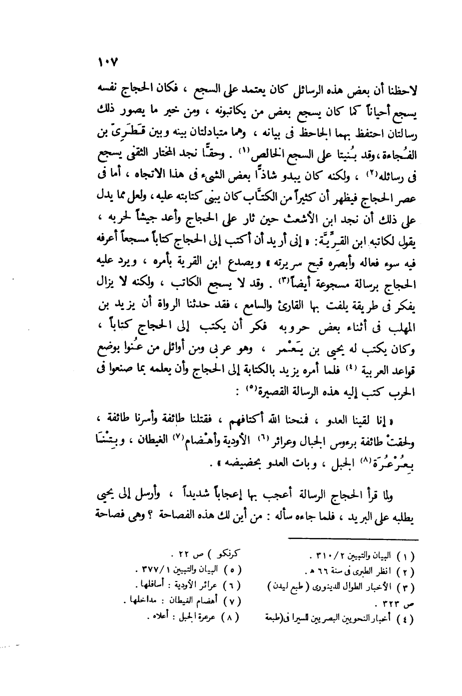 لاحظنا أن بعض هذه الرسائل كان يعتمد على السجع، فكان الحجاج نفسه يسجع أحيانا كما كان يسجع بعض من يكاتبونه، ومن خير ما يصور ذلك رسالتان احتفظ بهما الجاحظ في بيانه، وهما يتبادلتان بينه، وبين قطري بن الفجاءة، وقد بنيتا على السجع الخالص1، وحقا نجد المختار الثقفي يسجع في رسائله2، ولكنه كان يبدوا شاذا بعض الشيء في هذا الاتجاه، أما في عصر الحجاج، فيظهر أن كثيرًا من الكتاب كان يبني كتابته عليه، ولعل مما يدل على ذلك أن نجد ابن الأشعث حين ثار على الحجاج، وأعد جيشا لحربه، يقول لكتابه ابن القرية: "إني أريد أن أكتب إلى الحجاج كتابا مسجعا أعرفه فيه سوء فعاله، وأبصره قبح سريرته"، ويصدع ابن القرية بأمره، ويرد عليه الحجاج برسالة مسجوعة أيضا3، وقد لا يسجع الكاتب، ولكنه لا يزال يفكر في طريقة يلفت بها القارئ والسامع، فقد حدثنا الرواة أن يزيد بن المهلب في أثناء بعض حروبه، فكر أن يكتب إلى الحجاج كتابًا، وكان يكتب له يحيى بن يعمر، وهو عربي، ومن أوائل من عنوا بوضع قواعد العربية4، فلما أمره يزيد بالكتابة إلى الحجاج، وأن يعلمه بما صنعوا في الحرب كتب إليه هذه الرسالة القصيرة5: