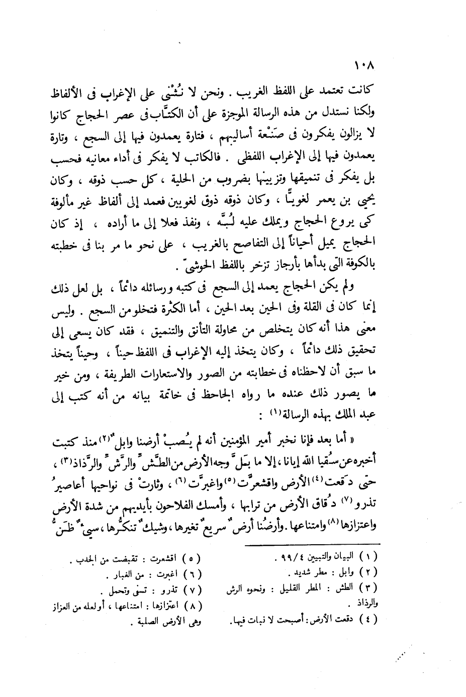 ولم يكن الحجاج يعمد إلى السجع في كتبه وسائله دائما، بل لعل ذلك إنما كان في القلة وفي الحين بعد الحين، أما الكثرة فتخلو من السجع. وليس معنى هذا أنه كان يتخلص من محاولة التأنق والتنميق، فقد كان يسعى إلى تحقيق ذلك دائما، وكان يتخذ إليه الإغراب في اللفظ حينا، وحينا يتخذ ما سبق أن لاحظناه في خطابته من الصور والاستعارات الطريفة، ومن خير ما يصور ذلك عنده ما رواه الجاحظ في خاتمة بيانه من أنه كتب إلى عبد الملك بهذه الرسالة1: