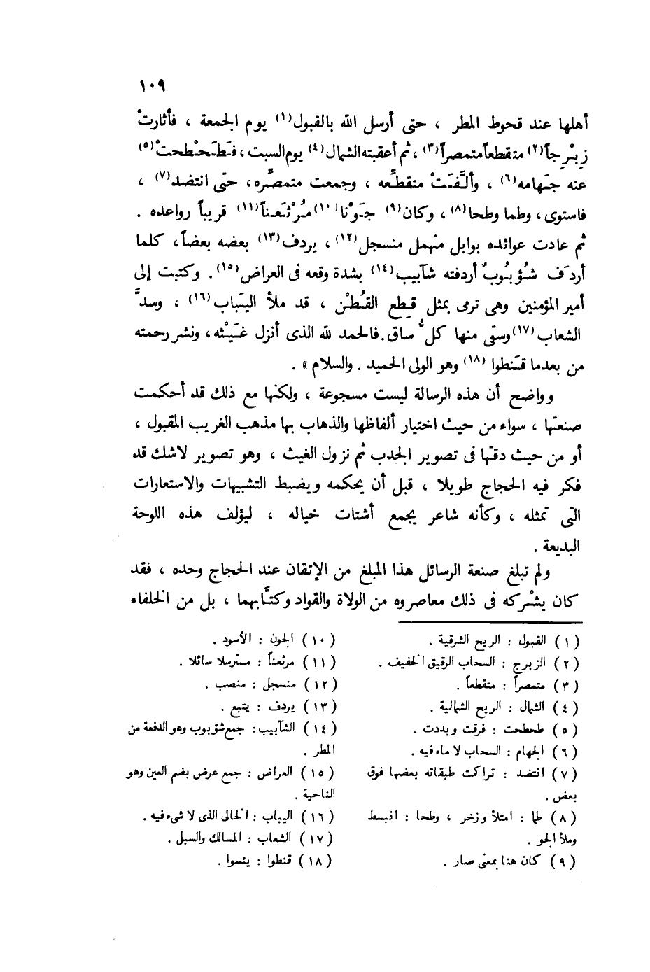 وواضح أن هذه الرسالة ليست مسجوعة، ولكنها مع ذلك قد أحكمت صنعتها، سواء من حيث اختيار ألفاظها، والذهاب بها مذهب الغريب المقبول، أو من حيث دقتها في تصوير الجذب ثم نزول الغيث، وهو تصوير لا شك قد فكر فيه الحجاج طويلا، قبل أن يحكمه ويضبط التشبيهات، والاستعارات التي تمثله. وكأن شاعر يجمع أشتات خياله، ليؤلف هذه اللوحة البديعة.