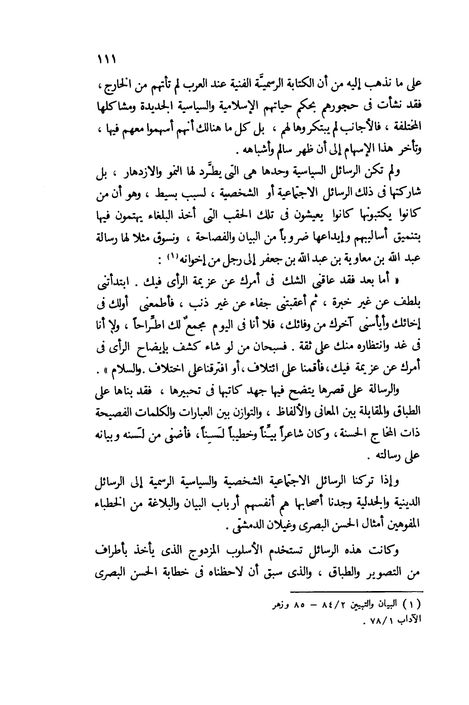 ولم تكن الرسائل السياسية وحدها هي التي يطرد لها النمو والازدهار، بل شاركتها في ذلك الرسائل الاجتماعية أو الشخصية، لسبب بسيط، وهو أن من كانوا يكتبونها كانوا يعيشون في تلك الحقب التي أخذ البلغاء يهتمون فيها بتنميق أساليبهم، وإبداعها ضروبا من البيان والفصاحة، ونسوق مثلا لها رسالة عبد الله بن معاوية بن عبد الله بن جعفر إلى رجل من إخوانه1: