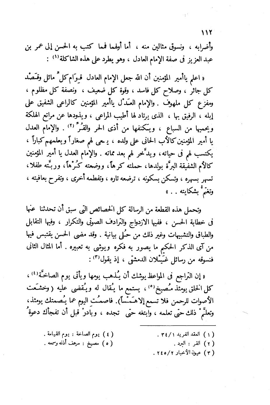 وأضرابه، ونسوق مثالين منه، أما أولهما فما كتب به الحسن إلى عمر بن عبد العزيز في صفة الإمام العادل، وهو يطرد على هذه الشاكلة1:
