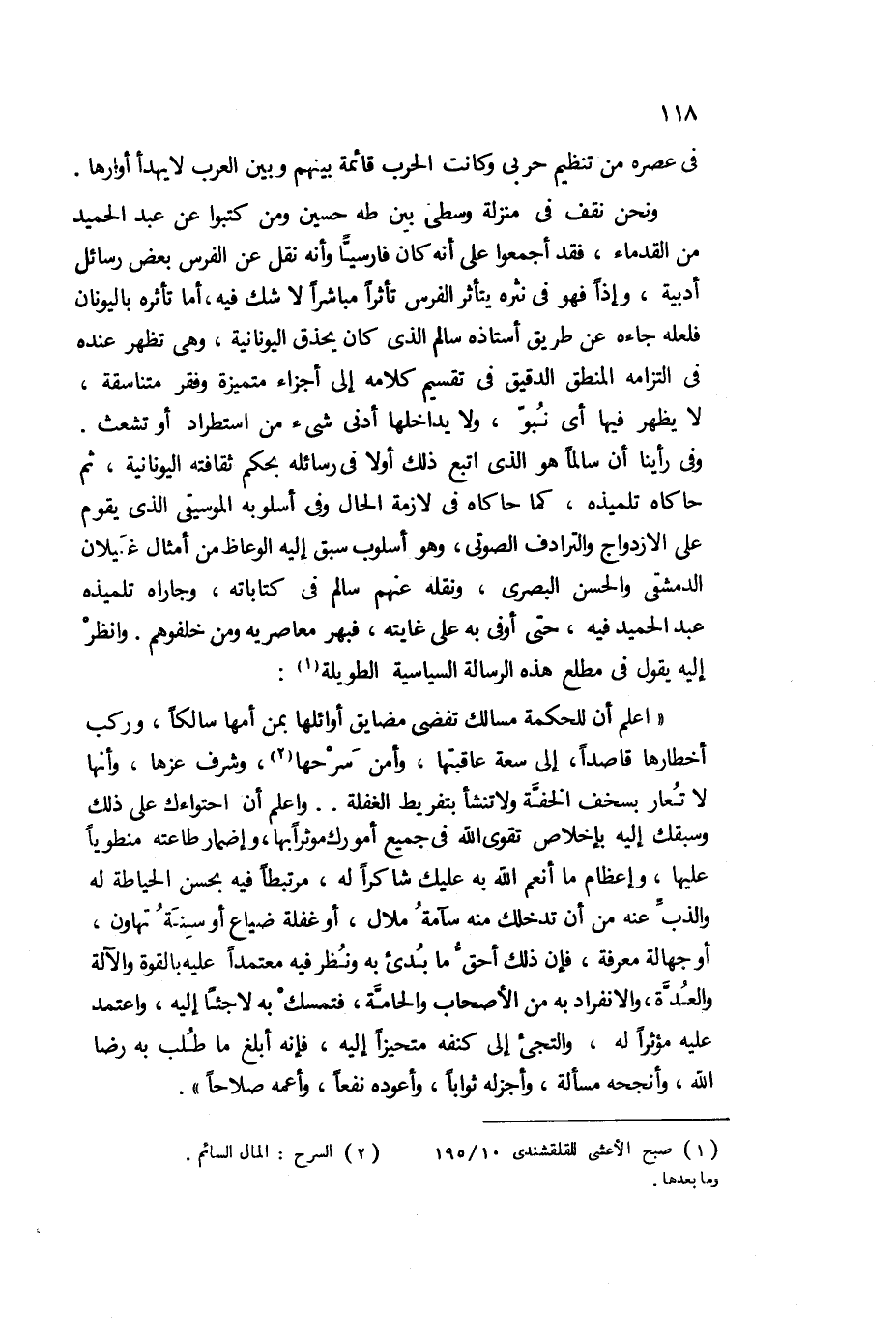 ونحن نقف في منزلة وسطى بين طه حسين، ومن كتبوا عن عبد الحميد من القدماء، فقد أجمعوا على أنه كان فارسيا، وأنه نقل عن الفرص بعض رسائل أدبية، وإذا فهو في نثره يتأثر الفرس تأثرا مباشرا لا شك فيه، أما تأثره باليونان فلعله جاءه عن طريق أستاذه سالم الذي كان يحذق اليونانية، وهي تظهر عنده في التزامه المنطق الدقيق في تقسيم كلامه إلى أجزاء متميزة وفقر متناسقة، لا يظهر فيها أي نبو، ولا يداخلها أدنى شيء من استطراد أو تشعث، وفي رأينا أن سالما هو الذي اتبع ذلك أولا في رسائله بحكم ثقافته اليونانية، ثم حاكاه تلميذه، كما حاكاه في لازمة الحال، وفي أسلوبه الموسيقي الذي يقوم على الازدواج والترادف الصوتي، وهو أسلوب سبق إليه الوعاظ من أمثال غيلان الدمشقي، والحسن البصري، ونقله عنهم سالم في كتاباته، وجاراه تلميذه عبد الحميد فيه، حتى أوفى به على غايته، فبهر معاصريه ومن خلفوهم، وانظر إليه يقول في مطلع هذه الرسالة السياسية الطويلة1: