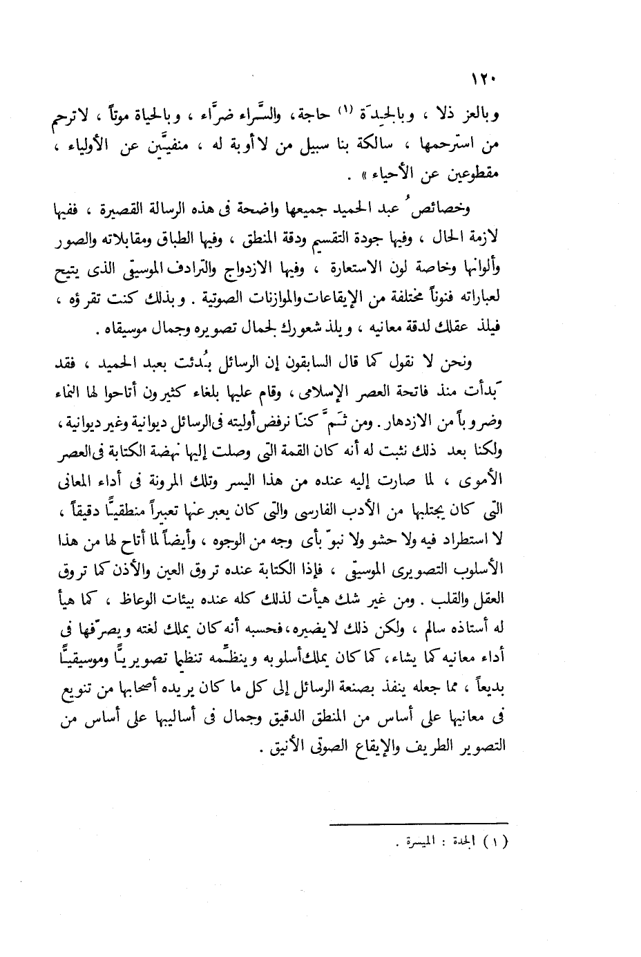 وخصائص عبد الحميد جميعه واضحة في هذه الرسالة القصيرة: ففيها لازمة الحال، وفيها جودة التقسيم ودقة المنطق، وفيها الطباق ومقابلاته، والصور وألوانها وخاصة لون الاستعارة، وفيها الازدواج والترادف الموسيقي الذي يتيح لعباراته فنونا مختلفة من الإيقاعات، والموازنات الصوتية، وبذلك كنت تقرؤه، فيلذ عقلك لدقة معانيه، ويلذ شعورك لجمال تصويره، وجمال موسيقاه.