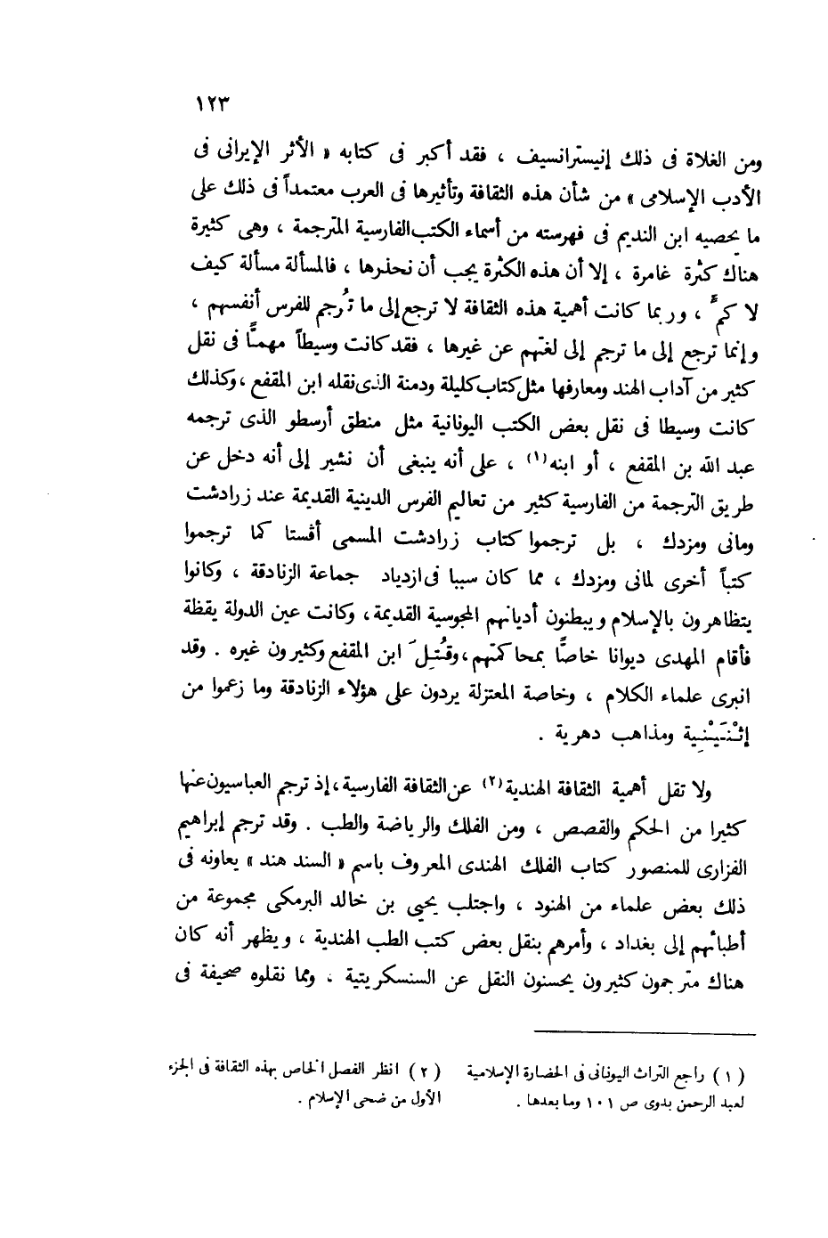 ومن الغلاة في ذلك إنيسترانسيف، فقد أكبر في كتابه "الأثر الإيراني في الأدب الإسلامي" من شأن هذه الثقافة، وتأثيرها في العرب معتمدًا في ذلك على ما يحصيه ابن النديم في فهرسته من أسماء الكتب الفارسية المترجمة، وهي كثيرة هناك كثرة غامرة، إلا أن هذه الكثرة يجب أن نحذرها، فالمسألة مسألة كيف لا كم، وربما كانت أهمية هذه الثقافة لا ترجع إلى ما ترجم للفرس أنفسهم، وإنما ترجع إلى ما ترجم إلى لغتهم عن غيرها، فقد كانت وسيطا مهما في نقل كثير من آداب الهند، ومعارفها مثل كتاب كليلة ودمنة الذي نقله ابن المقفع، وكذلك كانت وسيطا في نقل بعض الكتب اليونانية مثل منطق أرسطو الذي ترجمه عبد الله بن المقفع، أو ابنه1، على أنه ينبغي أن نشير إلى أنه دخل عن طريق الترجمة من الفارسية كثير من تعاليم الفرس الدينية القديمة عند زرادشت وماني ومزدك، بل ترجموا كتاب زرادشت المسمى أفستا كما ترجموا كتبا أخرى لماني ومزدك، مما كان سببا في ازدياد جماعة الزنادقة، وكانوا يتظاهرون بالإسلام، ويبطنون أديانهم المجوسية القديمة، وكانت عين الدولة يقظة، فأقام المهدي ديوانا خاصا بمحاكمتهم، وقتل ابن المقفع وكثيرون غيره. وقد انبرى علماء الكلام، وخاصة المعتزلة يردون على هؤلاء الزنادقة، وما زعموا من إثنينية ومذاهب دهرية.