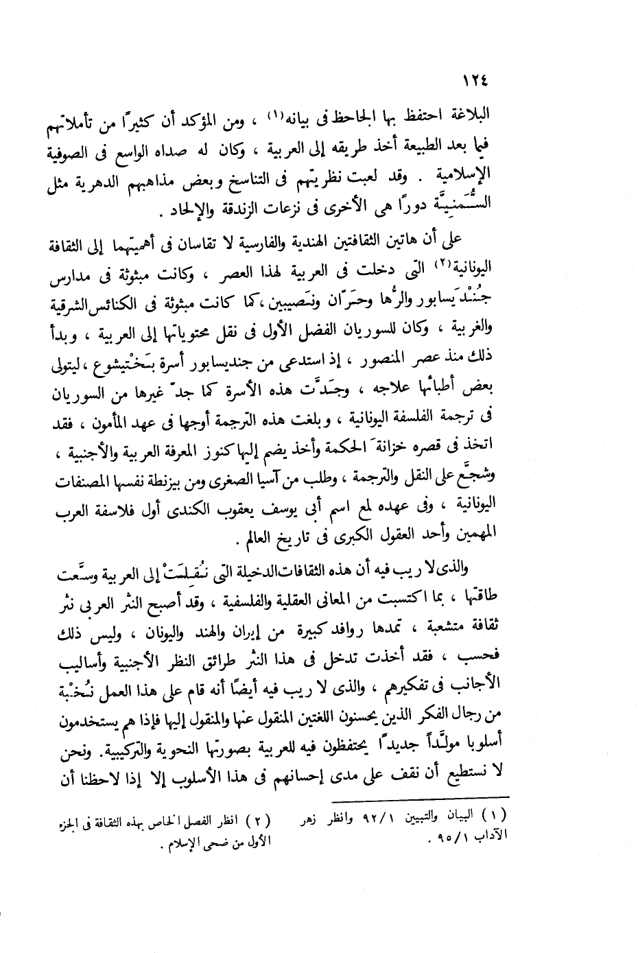 والذي لا ريب فيه أن هذه الثقافات الدخيلة التي نقلت إلى العربية، وسعت طاقتها، بما اكتسبت من المعاني العقلية والفلسفية، وقد أصبح النثر العربي نثر ثقافة متشعبة، تمدها روافد كبيرة من إيران الهند واليونان، وليس ذلك فحسب، فقد أخذت تدخل في هذا النثر طرائق النظر الأجنبية، وأساليب الأجانب في تفكيرهم، والذي لا ريب فيه أيضًا أنه قام على هذا العمل نخبة من رجال الفكر الذين يحسنون اللغتين المنقول المنقول عنها، والمنقول إليها فإذا هم يستخدمون أسلوبا مولدا جديدا يحتفظون فيه للعربية بصورتها النحوية والتركيبية، ونحن لا نستطيع أن نقف على مدى إحسانهم في هذا الأسلوب، إلا إذا لاحظنا أن