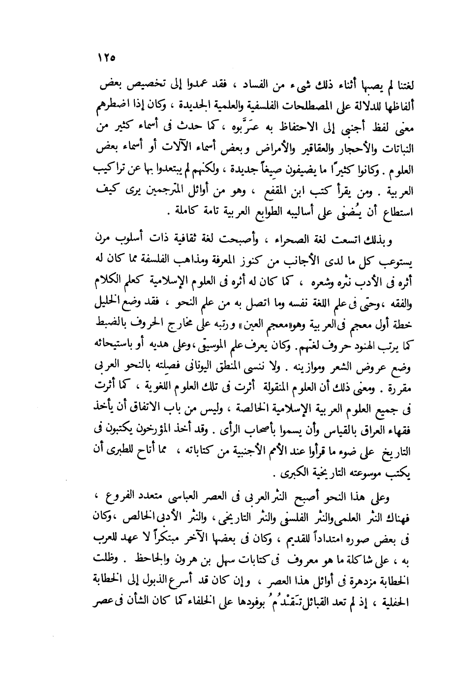 لغتنا لم يصبها أثناء ذلك شيء من الفساد، فقد عمدوا إلى تخصيص بعض ألفاظها للدلالة على المصطلحات الفلسفية والعلمية الجديدة، وكان إذا اضطرهم معنى لفظ أجنبي إلى الاحتفاظ به عربوه، كما حدث في أسماء كثير من النباتات والأحجار، والعقاقير والأمراض، وبعض أسماء الآلات أو أسماء بعض العلوم، وكانوا كثيرا ما يضيفون صيغا جديدة، ولكنهم لم يبتعدوا بها عن تراكيب العربية، ومن يقرأ كتب ابن المقفع، وهو من أوائل المترجمين يرى كيف استطاع أن يضفي على أساليبه الطوابع العربية تامة كاملة.