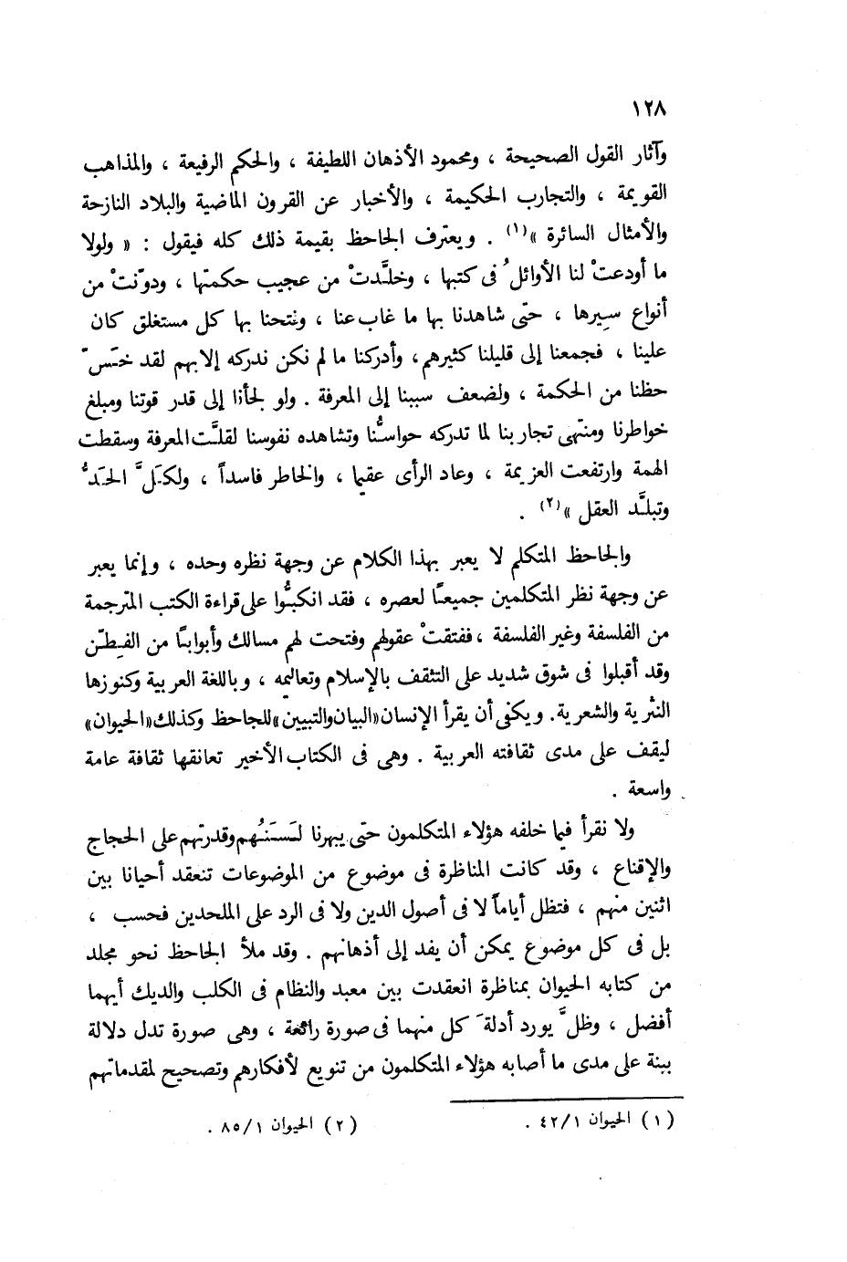 والجاحظ المتكلم لا يعبر بهذا الكلام عن وجهة نظره وحده، وإنما يعبر عن وجهة نظر المتكلمين جميعا لعصره، فقد انكبوا على قراءة الكتب المترجمة من الفلسفة وغير الفلسفة، ففتقت عقولهم وفتحت لهم مسالك، وأبوابا من الفطن وقد أقبلوا في شوق شديد على التثقف بالإسلام وتعاليمه، وباللغة العربية وكنوزها النثرية والشعرية، ويكفي أن يقرأ الإنسان "البيان والتبيين" للجاحظ وكذلك "الحيوان" ليقف على مدى ثقافته العربية، وهي في الكتاب الأخير تعانقها ثقافة عامة واسعة.