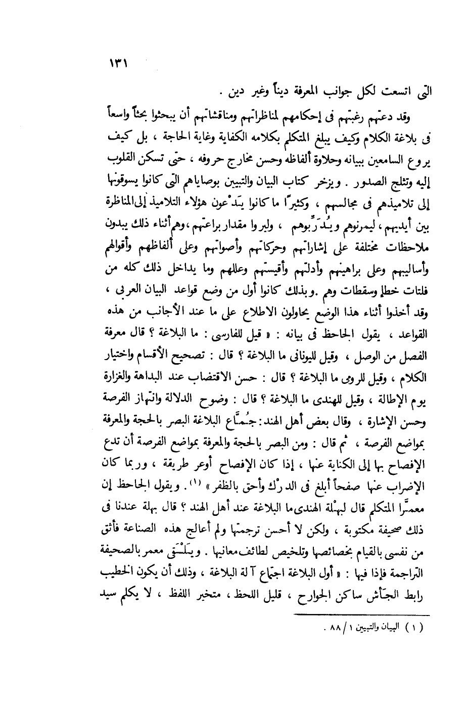 وقد دعتهم رغبتهم في إحكامهم لمناظراتهم، ومناقشاتهم أن يبحثوا بحثا واسعا في بلاغة الكلام، وكيف يبلغ المتكلم بكلامه الكفاية وغاية الحاجة، بل كيف يروع السامعين ببيانه، وحلاوةو ألفاظه وحسن مخارج حروفه، حتى تسكن القلوب إليه وتثلج الصدور، ويزخر كتاب البيان والتبيين بوصاياهم التي كانوا يسوقونها إلى تلاميذهم في مجالسهم، وكثيرًا ما كانوا يدعون هؤلاء التلاميذ إلى المناظرة بين أيديهم، ليمرنوهم ويدربوهم، وليروا مقدار براعتهم، وهم أثناء ذلك يبدون ملاحظات مختلفة على إشارتهم وحركاتهم، وأصواتهم وعلى ألفاظهم وأقوالهم وأساليبهم، وعلى براهينهم وأدلتهم وأقيستهم، وعللهم وما يداخل ذلك كله من فلتات خطإ وسقطات وهم، وبذلك كانوا أول من وضع قواعد البيان العربي، وقد أخذوا أثناء هذا الوضع يحاولون الإطلاع على ما عند الأجانب من هذه القواعد، يقول الجاحظ في بيانه: "قيل للفارسي: ما البلاغة؟ قال معرفة الفصل من الوصل، وقيل لليوناني: ما البلاغة؟ قال: تصحيح الأقسام واختيار الكلام، وقيل للرومي: ما البلاغة؟ قال: حسن الاقتضاب عند البداهة والغزارة يوم الإطالة، وقيل للهندي: ما البلاغة؟ قال: وضوح الدلالة وانتهاز الفرصة وحسن الإشارة، وقال بعض أهل الهند: جماع البلاغة البصر بالحجة والمعرفة بمواضع الفرصة، ثم قال: ومن البصر بالحجة والمعرفة بمواضع الفرصة أن تدع الإفصاح بها إلى الكناية عنها، إذا كان الإفصاح أوعر طريقة، وربما؟؟؟ الإضراب عنها صفحا أبلغ في الدرك وأحق بالظفر"1. ويقول الجاحظ: إن معمرا المتكلم قال لبهلة الهندي: ما البلاغة عند أهل الهند؟ قال بهلة: عندنا في ذلك صحيفة مكتوبة، ولكن لا أحسن ترجمتها، ولم أعالج هذه الصناعة فأثق من نفسي بالقيام بخصائصها، وتلخيص لطائف معانيها، ويلقى معمر بالصحيفة التراجمة فإذا فيها: "أول البلاغة اجتماع آلة البلاغة، وذلك أن يكون الخطيب رابط الجأش ساكن الجوارح، قليل اللحظ، متخير اللفظ، لا يكلم سيد
