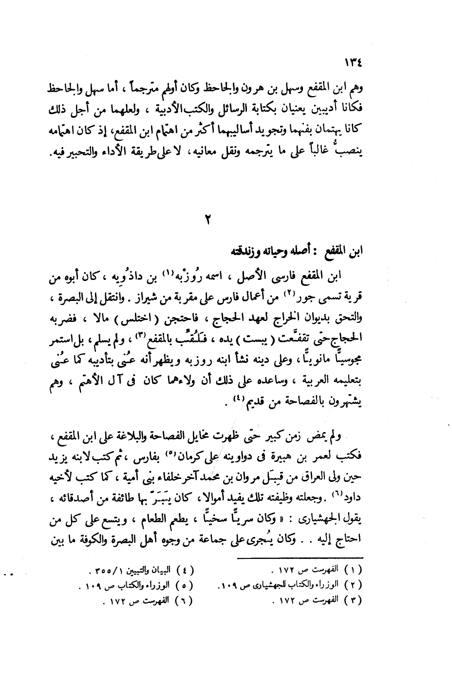 ابن المقفع فارسي الأصل، اسمه روزبه1 بن داذويه، كان أبوه من قرية تسمى جور2 من أعمال فارس على مقربة من شيزار، وانتقل إلى البصرة، والتحق بديوان الخراج لعهد الحجاج، فاحتجن "اختلس" مالا، فضربه الحجاج حتى تقفعت "يبست" يده، فلقب بالمقفع3، ولم يسلم، بل استمر مجوسيا مانويا، وعلى دينه نشأ ابنه روزبه، ويظهر أنه عني بتأديبه كما عني بتعليمه العربية، وساعده على ذلك أن ولاءهما كان في آل الأهتم، وهم يشتهرون بالفصاحة من قديم4.