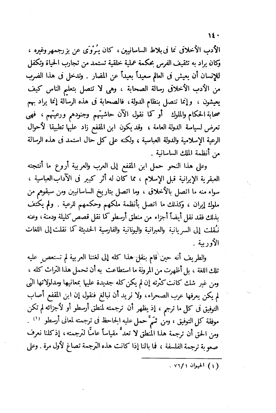 والطريف أن حين قام بنقل هذا كله إلى لغتنا العربية لم تستعص عليه تلك اللغة، بل أظهرت من المرونة ما استطاعت به أن تحمل هذا التراث كله، ومن غير شك كانت كثرته إن لم يكن كله جديدة عليها، بمعانيها ومدلولاتها التي لم يكن يعرفها عرب الصحراء، ولا نريد أن نبالغ، فنقول: إن ابن المقفع أصاب التوفيق في كل ما ترجم، إذ يظهر أن ترجمته لمنطق أرسطو أو لأجزائه لم تكن موفقة كل التوفيق، ومن ثم حمل عليه الجاحظ في ترجمته لمعاني أرسطو1، ومن الحق أن ترجمة هذا المنطق لا تعد مقياسا عاما لترجمته، إذ كلنا نعرف صعوبة ترجمة الفلسفة، فما بالنا إذا كانت هذه الترجمة تصاغ لأول مرة، وعلى