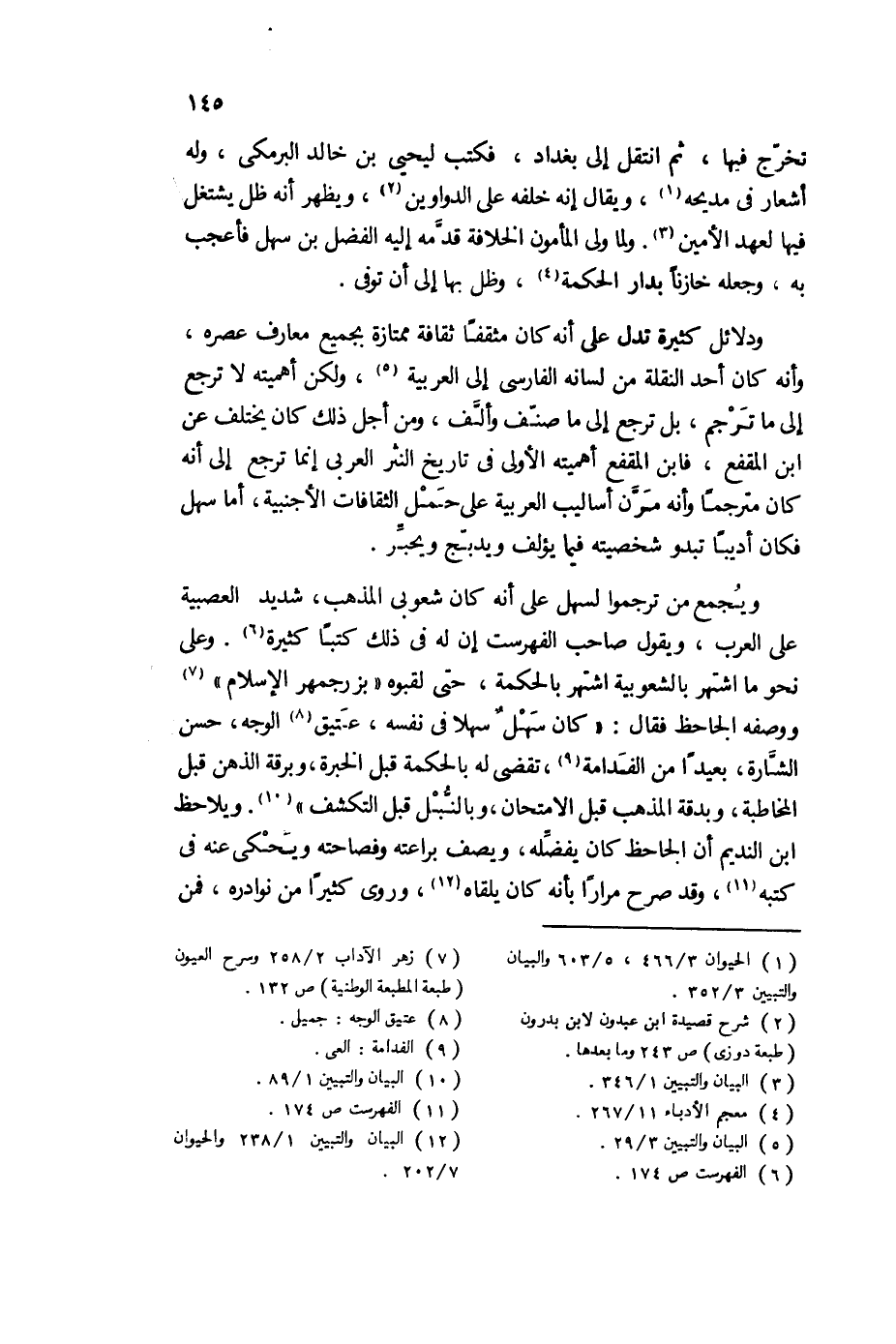 ودلائل كثيرة تدل على أنه كان مثقفا ثقافة ممتازة بجميع معارف عصره، وأنه كان أحد النقلة من لسانه الفارسي إلى العربية5، ولكن أهميته لا ترجع إلى ما ترجم، بل ترجع إلى ما صنف وألف، ومن أجل ذلك كان يختلف عن ابن المقفع، فابن المقفع أهميته الأولى في تاريخ النثر العربي، إنما ترجع إلى أنه كان مترجما، وأنه مرن أساليب العربية على حمل الثقافات الأجنبية، أما سهل فكان أديبا تبدو شخصيته فيها يؤلف، ويدبج، ويحبر.