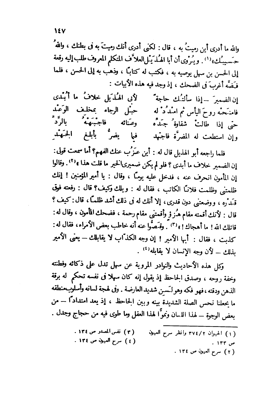 والله ما أدري أين رميت به، قال: لكني أدري أنك رميت به في بطنك، والله حسيبك"1. ويروى أن أبا الهذيل العلاف المتكلم المعروف طلب إليه رقعة إلى الحسن بن سهل يوصيه به، فكتب له كتابا، وذعهب به إلى الحسن، فلما فضه أغرب في الضحك، إذ وجد فيه هذه الأبيات: