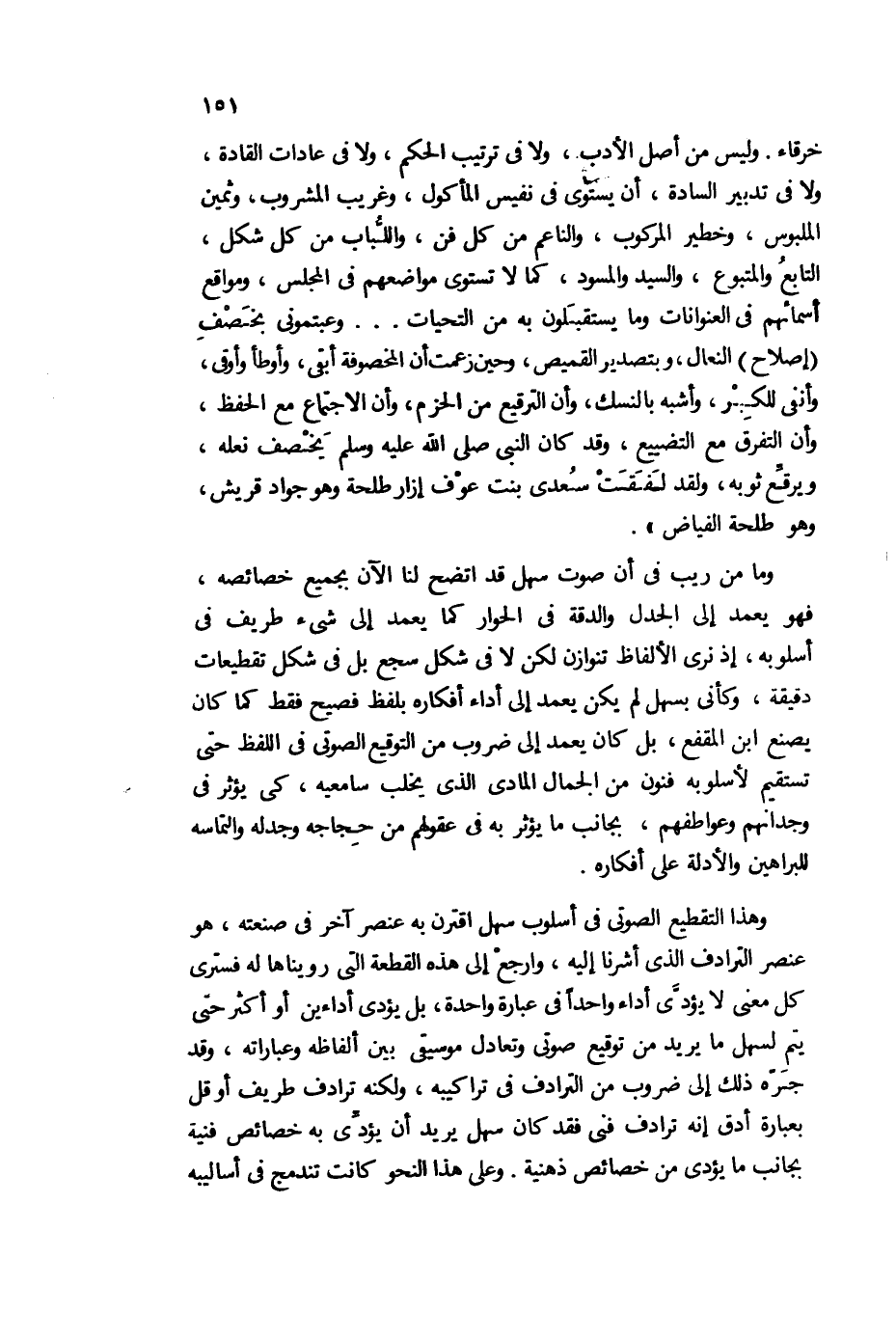 وهذا التقطيع الصوتي في أسلوب سهل اقترن به عنصر آخر في صنعته، هو عنصر الترادف الذي أشرنا إليه، وارجع إلى هذه القطعة التي رويناها له فسترى كل معنى لا يؤدى أداء واحدا في عبارة واحدة، بل يؤدي أداءين أو أكثر حتى يتم لسهل ما يريد من توقيع صوتي، وتعادل موسيقي بين ألفاظه وعباراته، وقد جره ذلك إلى ضروب من الترادف في تراكيبه، ولكنه ترادف طريف أو قل بعبارة أدق إنه ترادف فني، فقد كان سهل يريد أن يؤدي به خصائص فنية بجانب ما يؤدي من خصائص ذهنية، وعلى هذا النحو كانت تندمج في أساليبه