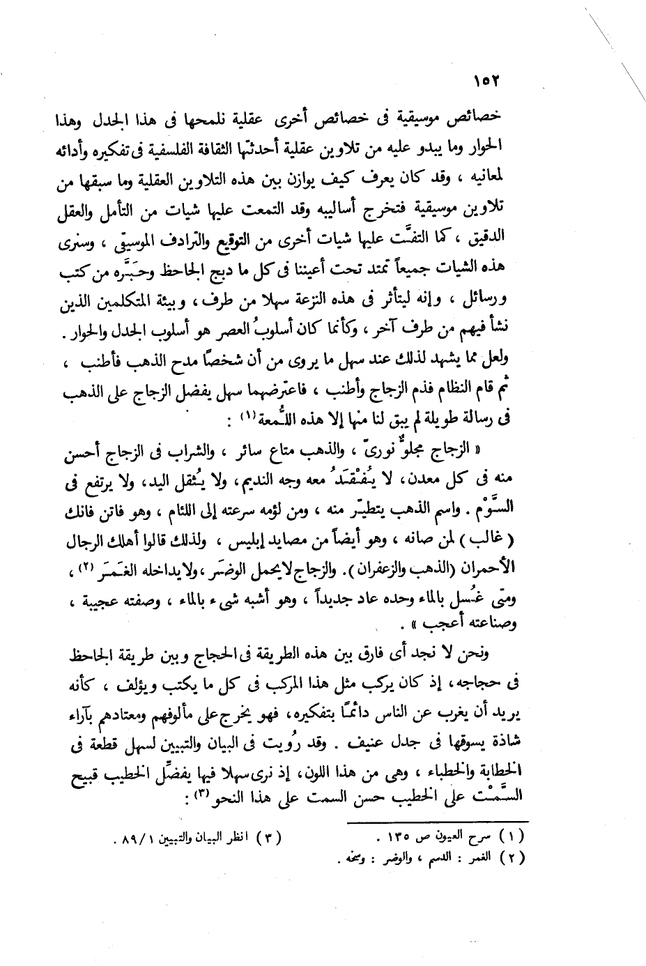 خصائص موسيقية في خصائص أخرى عقلية نلمحها في هذا الجدل، وهذا الحوار وما يبدو عليه من تلاوين عقلية أحدثتها الثقافة الفلسفية في تفكيره، وأدائه لمعانيه، وقد كان يعرف كيف يوازن بين هذه التلاوين العقلية، وما سبقها من تلاوين موسيقية، فتخرج أساليبه وقد التمعت عليها شيات من التأمل والعقل الدقيق، كما التفت عليها شيات أخرى من التوقيع، والترادف الموسيقي، وسنرى هذه الشيات جميعا تمتد تحت أعيننا في كل ما دبج الجاحظ، وحبره من كتب ورسائل، وإنه ليتأثر في هذه النزعة سهلا من طرف، وبيئة المتكلمين الذين نشأ فيهم من طرف آخر، وكأنما كان أسلوب العصر هو أسلوب الجدل الحوار، ولعل مما يشهد لذلك عند سهل ما يروى من أن شخصا مدح الذهب فأطنب، ثم قام النظام فذج الزجاج وأطنب، فاعترضهما سهل يفضل الزجاج على الذهب في رسالة طويلة لم يبق لنا منها إلا هذه اللمعة1: